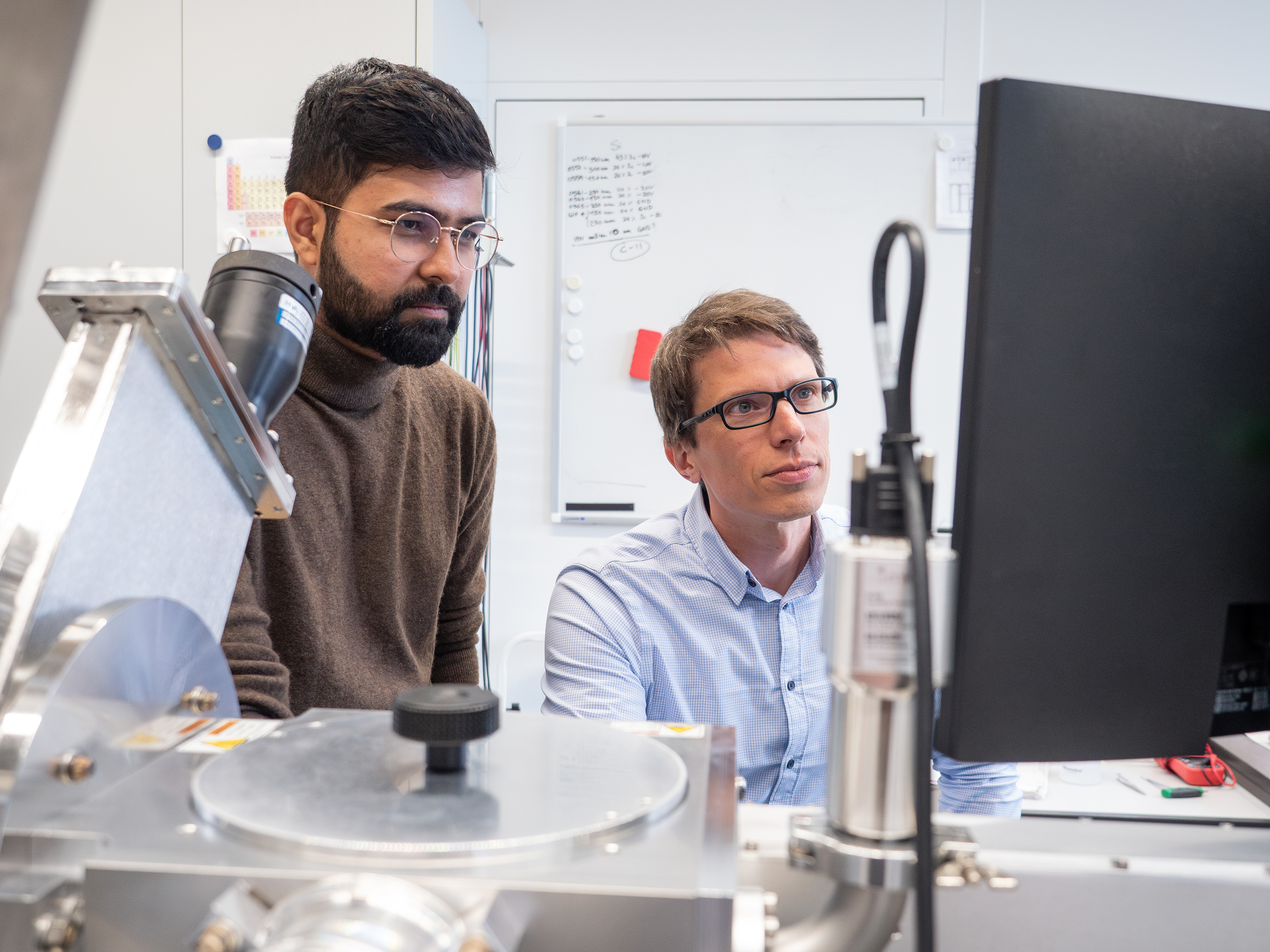 Im Rahmen seiner Doktorarbeit entwickelte Jyotish Patidar eine clevere Lösung. Nicht alle Ionen kommen gleichzeitig am Ziel an. Der Grossteil der Argon-Ionen befindet sich im Plasma vor dem Target. Somit sind sie oft schneller am Substrat angelangt als die Target-Ionen, die erst einmal aus dem Target geschlagen werden müssen und zusätzlich die gesamte Strecke überqueren müssen. Patidars Kunstgriff war das Timing: «Wenn wir die Spannung am Substrat genau im richtigen Moment anlegen, beschleunigen wir nur die gewünschten Ionen», erklärt Siol. Die Argon-Ionen sind zu diesem Zeitpunkt bereits vorbeigeflogen – ohne die zusätzliche Beschleunigung haben sie zu wenig Energie, um auf dem Substrat Fuss zu fassen.