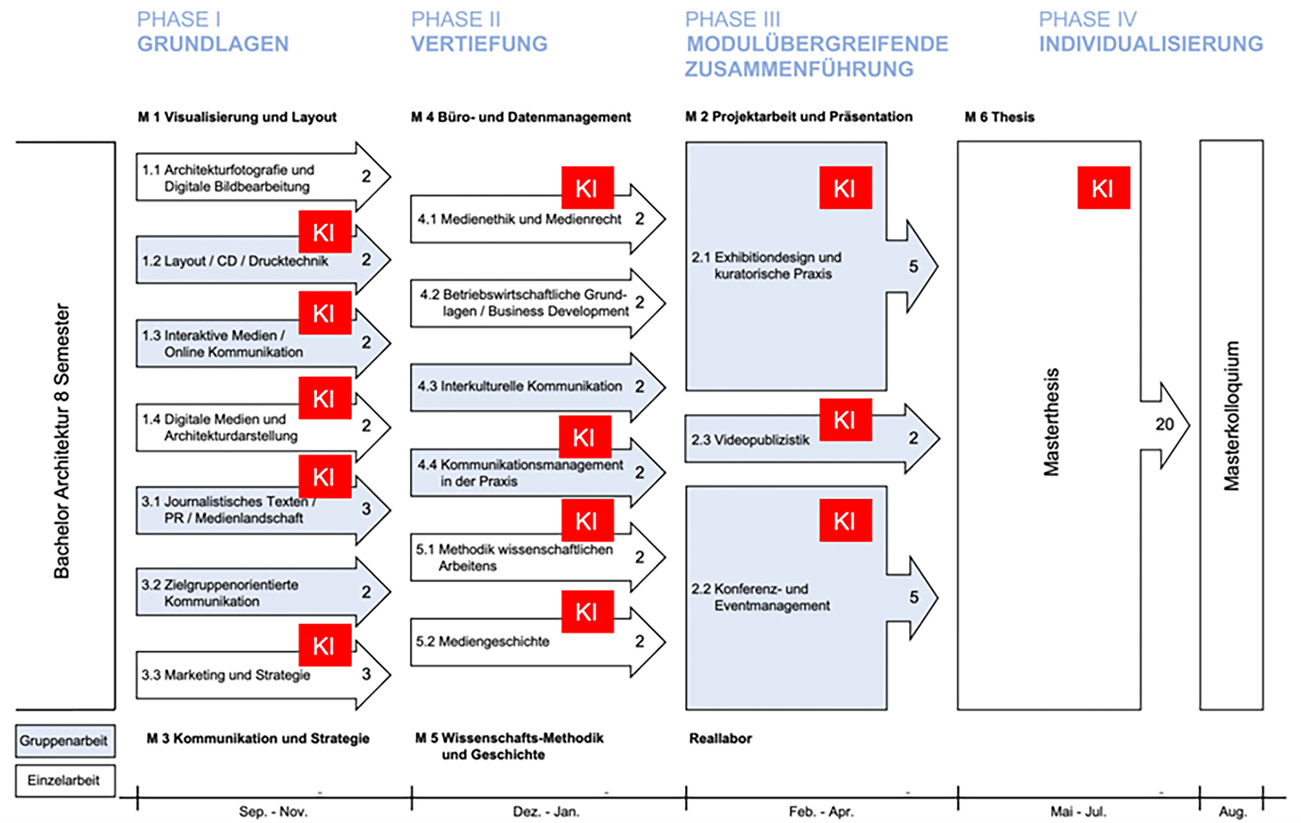 Bewerben können sich Absolvent:innen der Studiengänge Architektur, Innenarchitektur und Landschaftsarchitektur sowie berufserfahrene Architekt:innen, die sich auf Kommunikation und KI spezialisieren möchten.