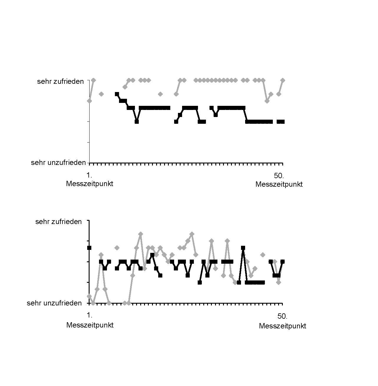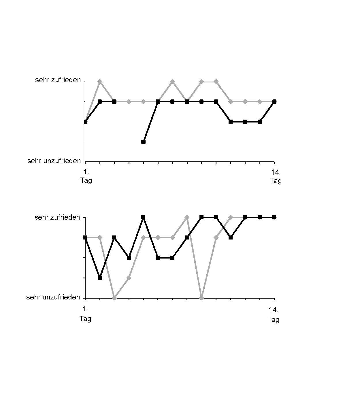 Zwei Paare mit durchschnittlichen (oben) versus starken (unten) Schwankungen in der Beziehungszufriedenheit, gemessen einmal täglich über 14 Tage hinweg