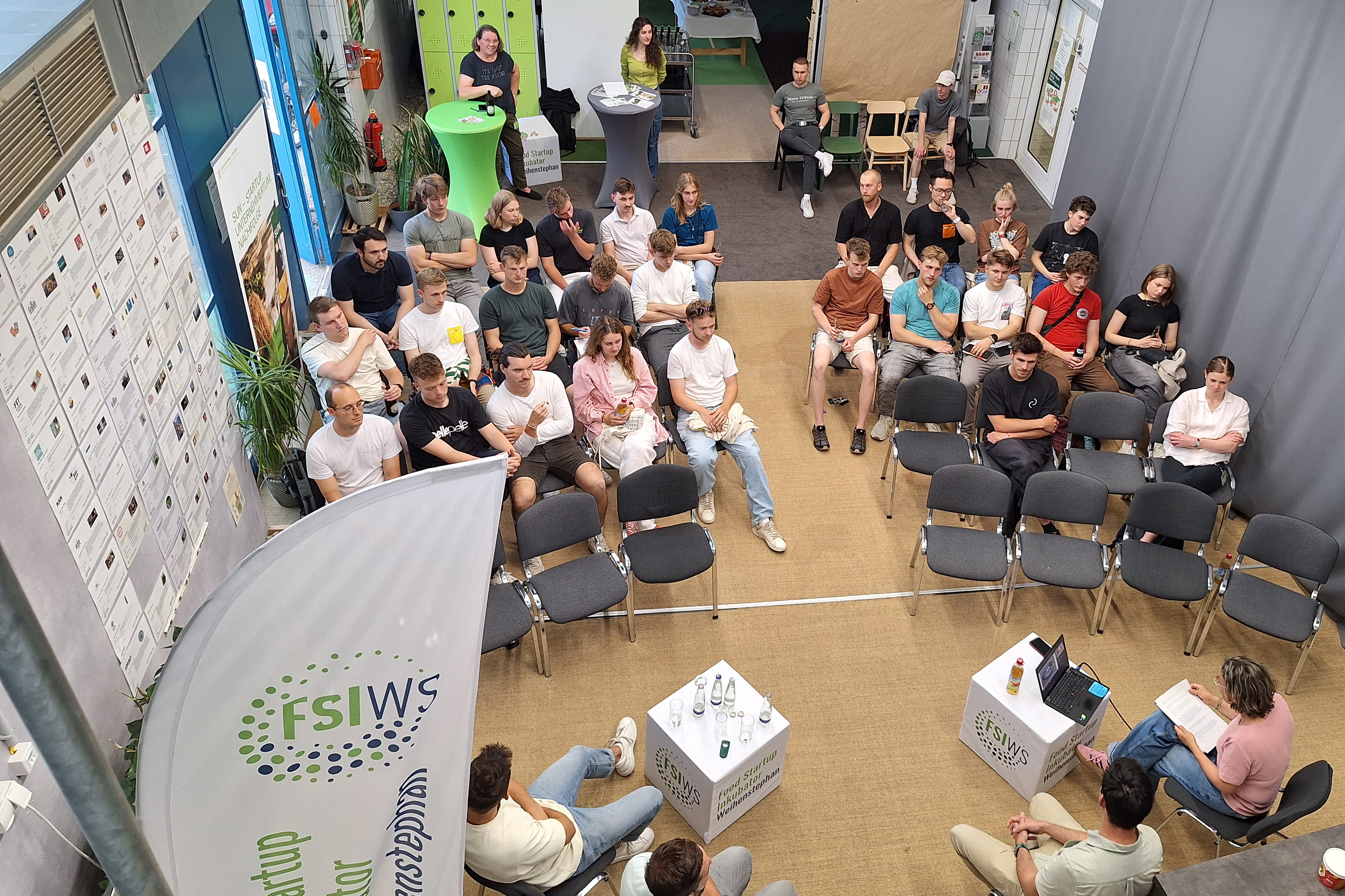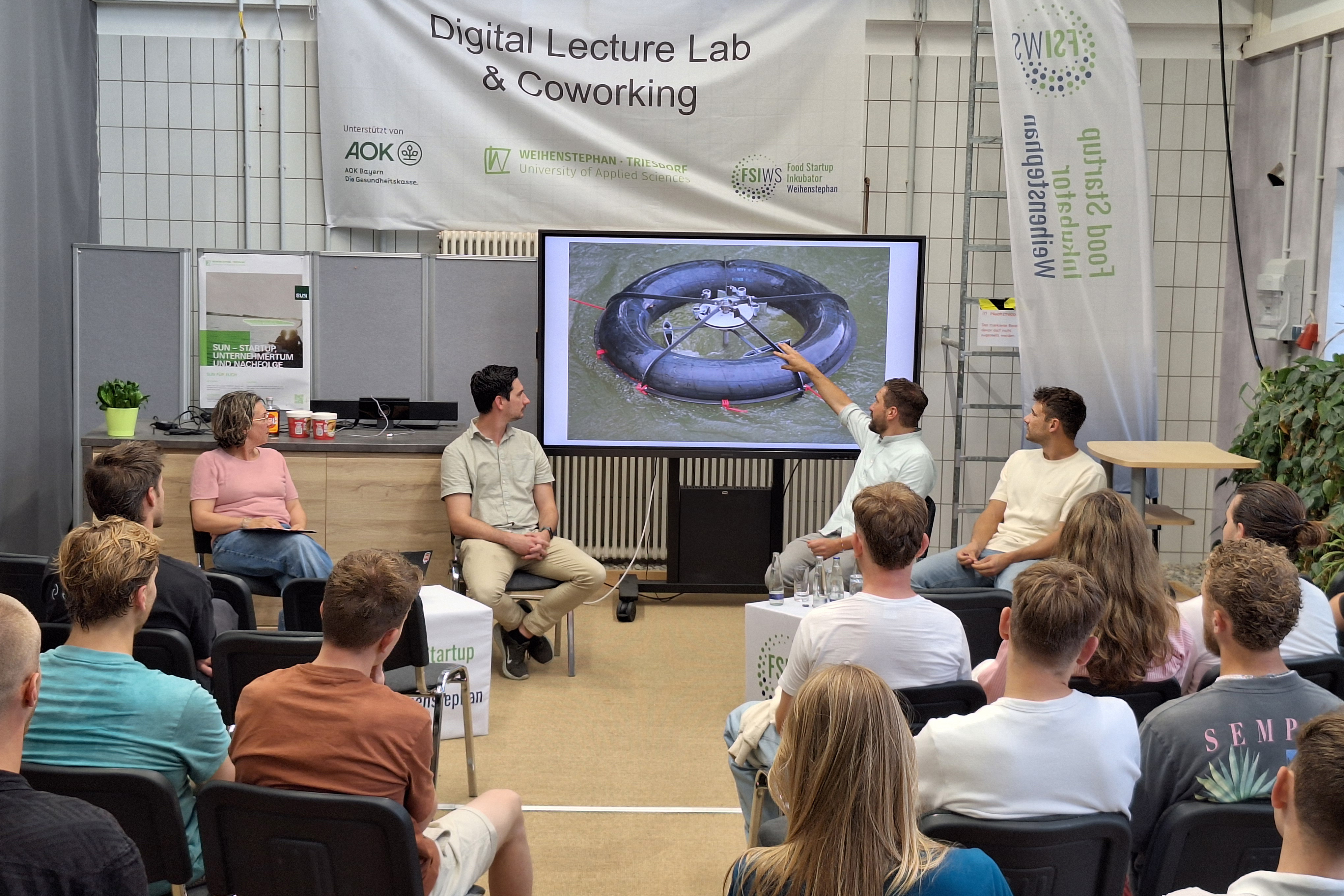 Rund 35 Teilnehmende verfolgten die Podiumsgespräche am Food Startup Inkubator Weihenstephan (FSIWS) und beteiligten sich bei geselliger Atmosphäre am anschließenden „Netzwerken“. Diesmal waren dabei: Sebastian Vitz, Co-Founder von „Maentum“ http://maentum.de/ (ehemals Plug-in-Festivals). Er bietet mobile Powerstationen, Kühlboxen und Solarpanels für Festivals an. Sebastian Gründig, Co-Founder von „WechselFabrik“ https://wechselfabrik.de/, stellte sein Vergleichs- und Wechselportal für Stromkunden vor. Mit dabei war auch Prof. Dr. Andreas Zeiselmair https://www.hswt.de/person/andreas-zeiselmair, der vor seiner Professur an der HSWT mit „mobile hydro“https://www.youtube.com/watch?v=7f_J32Q-ASM ein Startup mitgegründet hatte, das kostengünstige dezentrale Wasserkraftwerke herstellt und nun Gründungsbotschafter der Fakultät Wald und Forstwirtschaft ist.