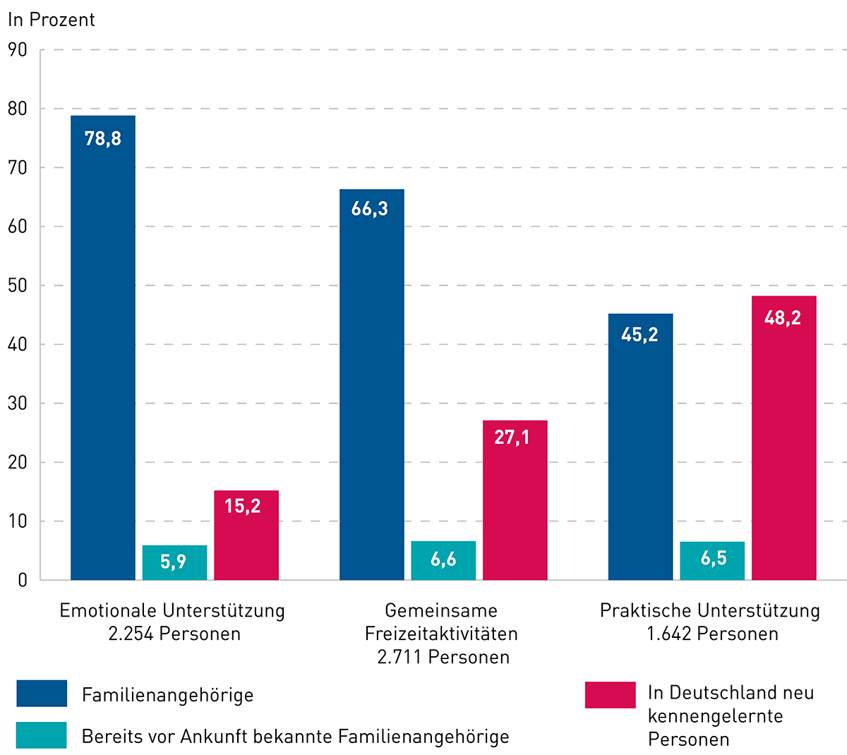 Die neu geknüpften Kontakte bezeichnen die Befragten überwiegend als Freundinnen, Freunde oder Bekannte, die für emotionale Unterstützung und für die gemeinsame Freizeitgestaltung sehr wichtig sind. „Soziale Beziehungen können sowohl den Zugang zu relevanten Informationen erleichtern als auch wesentlich zum Wohlbefinden von Schutzsuchenden beitragen“, ergänzt Sauer. Für praktische Hilfen wiederum sind auch Personen aus der Geflüchtetenhilfe – oft aus Deutschland – wichtig: 35% der neu Kennengelernten, die praktische Unterstützung bieten, sind ehrenamtlich oder professionell Helfende.