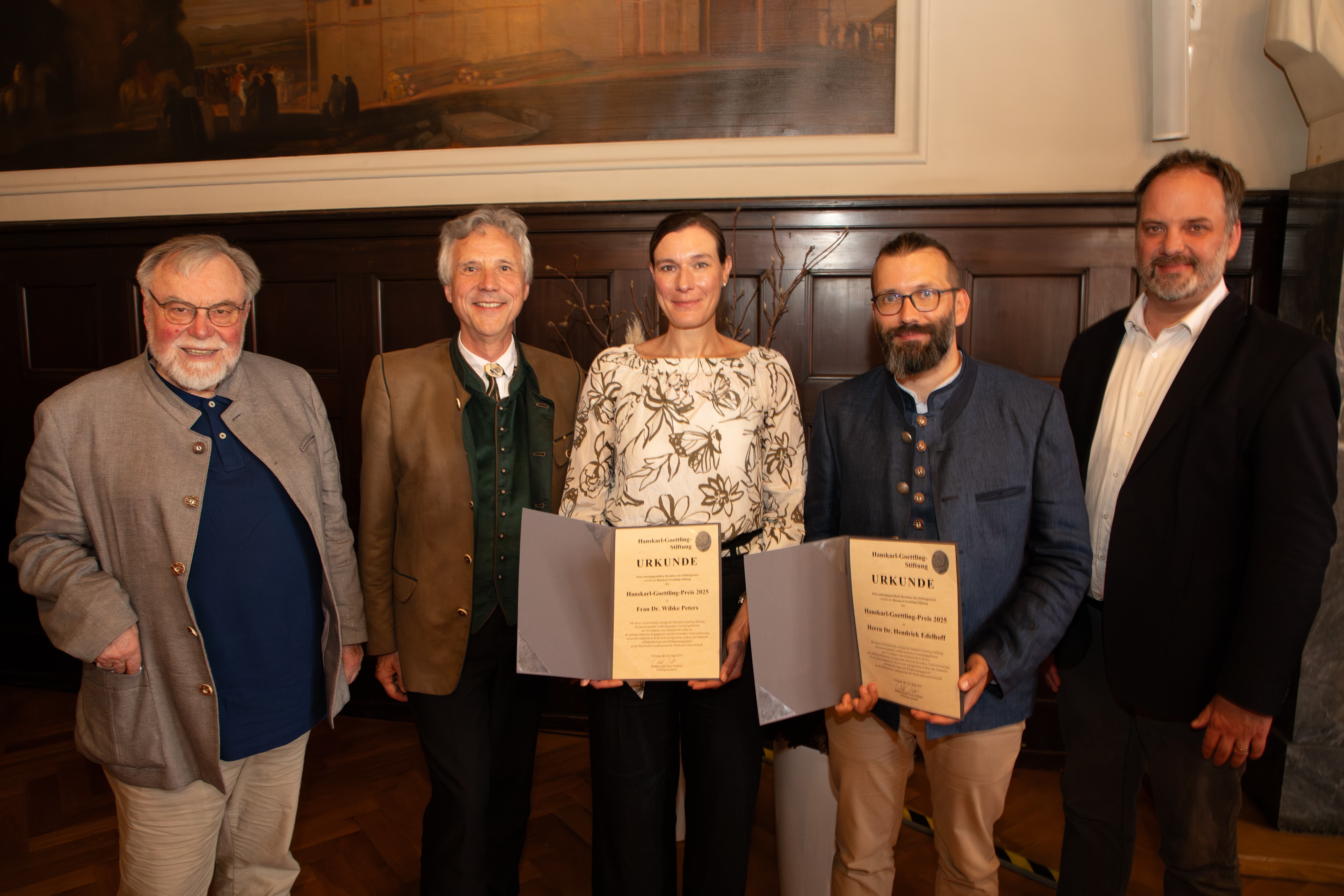 Zahlreiche Ehrengäste aus Wissenschaft, Politik und Forstverwaltung – nahmen an der feierlichen Preisverleihung im historischen Festsaal des Freisinger Rathauses teil. Die Laudatio ließ sich der Altmeister der Wildtierforschung, der bereits 84- jährige und weltweit renommierte Prof. Dr. Wolfgang Schröder nicht nehmen. Er hob die hohe wissenschaftliche Qualität, die methodische Innovationskraft sowie die praxisnahe Relevanz der Forschungsarbeit hervor: „Peters und Edelhoff sind von Kindesbeinen an berufen für die Wildbiologie und brennen für ihre Arbeit. Sie vereinen wissenschaftliche Exzellenz mit einem tiefen Verständnis ökologischer Zusammenhänge – das macht ihre Forschung so bedeutsam!“