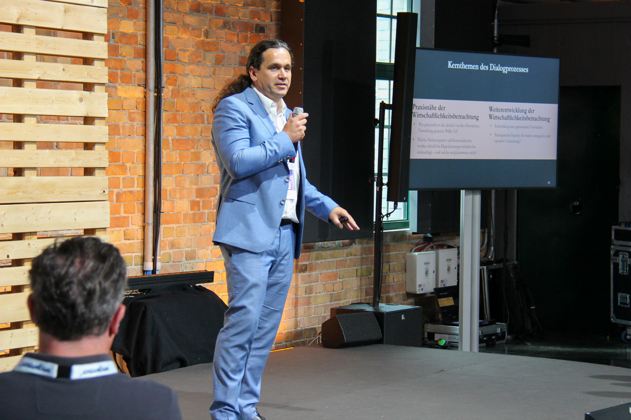 Im Rahmen des Zukunftskongresses präsentierte Prof. Pedrosa seinen Dialogprozess mit Problemanalyse und Vorgehensweise. Die Jury, bestehend aus Inga Karrer (E-Government-Koordinatorin der DIHK & Vorstandsmitglied des NEGZ), Oliver Lorenz (wegweiser GmbH) und Harald Felling (init AG), prämierte die Skizze für den praxistauglichen und lösungsorientierten Ansatz im Themenfeld „Digitalrendite“.