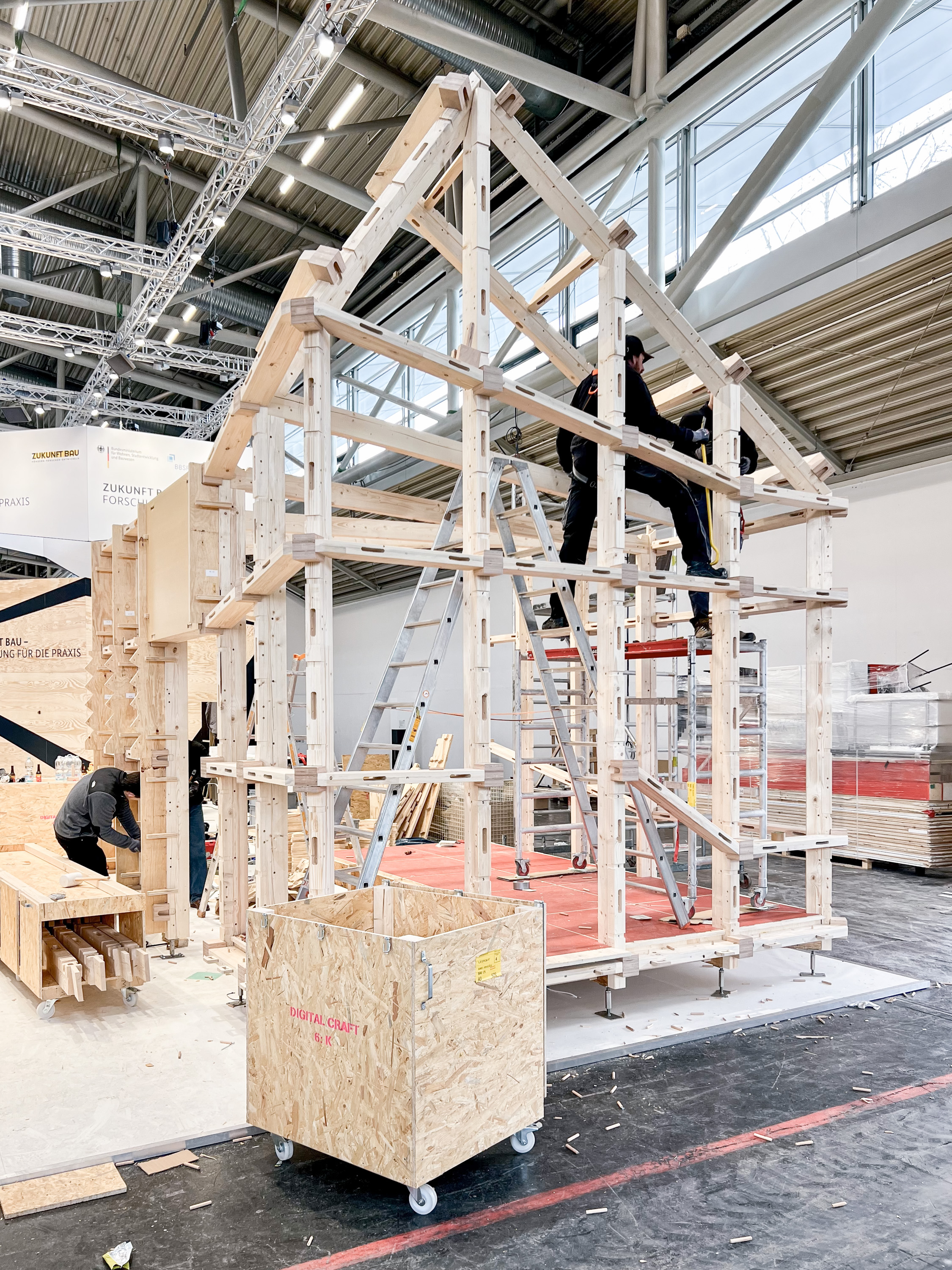 Der erste Prototyp – ein rund 20 m² großes Gebäude – wurde bereits realisiert und auf der BAU 2025 in München vorgestellt. Besonders geeignet ist das innovative Bausystem für urbane Nachverdichtungsprojekte – etwa Aufstockungen und Erweiterungen von Bestandsgebäuden. Für Krüger und sein Forschungsteam steht nun eine angewandte Testphase im Fokus: „Der nächste Schritt ist der Bau eines weiterentwickelten Prototyps, der in der Stadt getestet werden soll.“