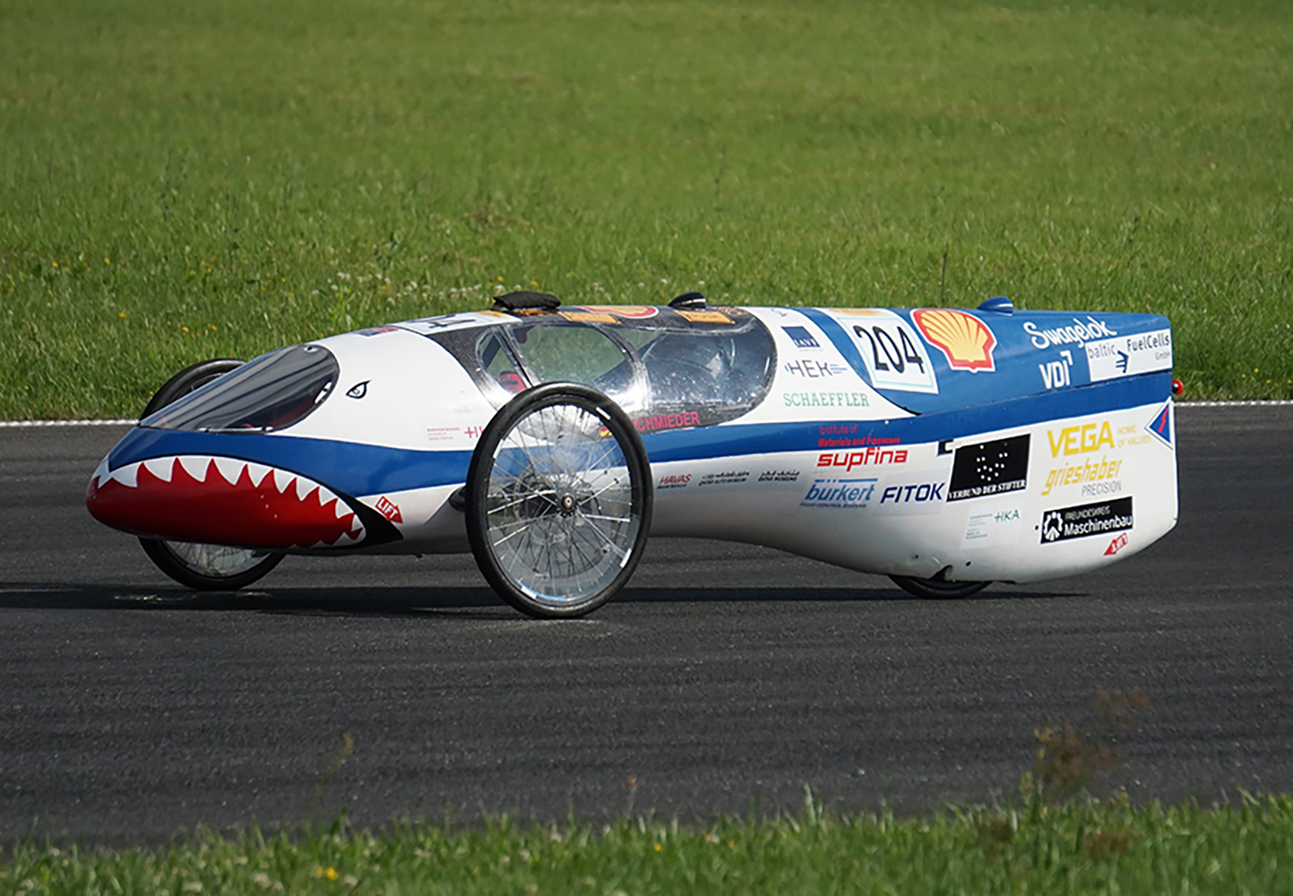 Nach vier Jahren Pause war das studentische Team der Hochschule Karlsruhe (HKA) 2024 erstmalig mit einem neu entwickelten Brennstoffzellenantrieb beim Shell Eco-marathon in Frankreich an den Start gegangen. Nun konnte es für die aktuelle Saison Optimierungspotenziale ausschöpfen und in der immer stärker werdenden Wettbewerbsgruppe der brennstoffzellengetriebenen Prototypenfahrzeuge (14 teilnehmende Teams, davon 9 mit gültigem Wertungslauf) beim Wettbewerb Shell Eco-marathon in Polen überzeugen. Mit 407 km Reichweite pro Kubikmeter Wasserstoff (ca. 90 Gramm) oder umgerechnet 1237 km mit der Energie eines Liters Benzin wurden die Ergebnisse des letzten Jahres (305 km bzw. 925 km) deutlich übertroffen. Das HKA-Team konnte sich mit dem 5. Platz im oberen Mittelfeld behaupten. Unter Berücksichtigung der Resultate aus den Shell Eco-marathon-Wettbewerben in Amerika und Asien gehört das Fahrzeug der Hochschule Karlsruhe daher aktuell zu den weltweit zehn energieeffizientesten dieser Klasse.