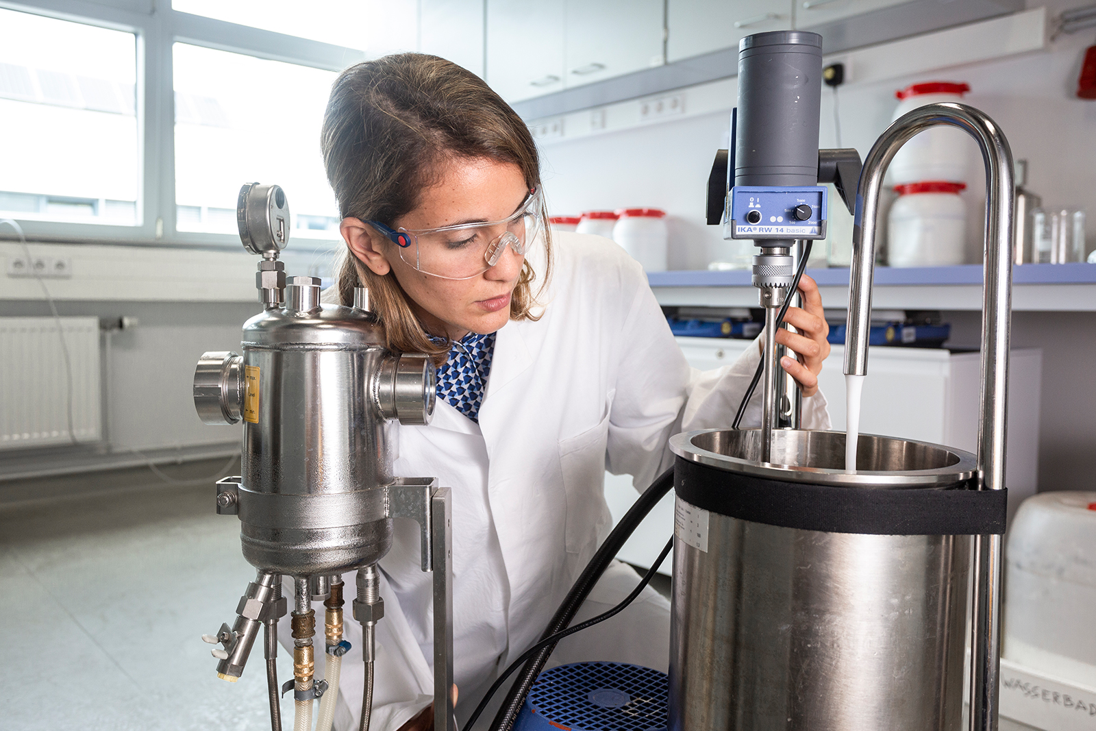 Im Projekt entwickeln die Partner passende PCM-Emulsionen mit Schmelztemperaturen zwischen 12 und 18 Grad Celsius, 20 und 28 Grad sowie 45 und 50 Grad für jede Anwendung, sei es Gebäudeklimatisierung, Industrieanlagen, Batteriekühlung oder Wärmepumpe. Alle entwickelten Emulsionen wurden bereits in einem hydraulischen Testkreis mit Zentrifugalpumpe, verschiedenen Ventilen, Membranausgleichsgefäß und Plattenwärmeübertrager thermomechanisch getestet. Sie können bis zu 100 000 Zyklen überstehen. Dabei haben die Forschenden die PCM-Emulsionen zunächst im Labormaßstab mit Herstellungsmengen von bis zu fünf Litern entwickelt, charakterisiert und getestet. Anschließend wurden die Rezepturen in den Technikumsmaßstab überführt und Mengen von bis zu 100 Litern hergestellt.