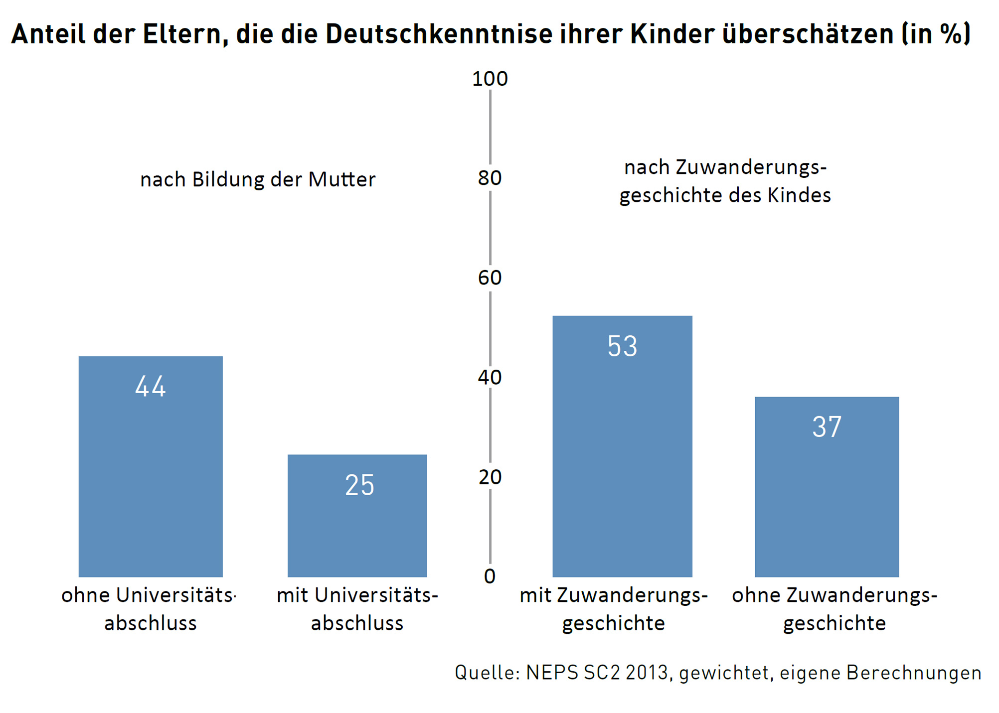 Die Art und Weise, wie Schulen über den Leistungsstand von Schülerinnen und Schülern informieren, bestimmt maßgeblich das Einschätzungsvermögen von Eltern im Hinblick auf die Leistungsfähigkeiten ihrer Kinder - und beeinflusst somit die Unterstützung und das Engagement der Eltern. Wie die beiden Studienautorinnen darlegen, schätzen Eltern die schulischen Leistungen ihrer Kinder in Deutsch, Mathematik und Naturwissenschaften in vielen Fällen höher ein als sie tatsächlich sind; besonders in niedriger gebildeten oder zugewanderten Familien werden die Fähigkeiten überschätzt. „Diese Fehleinschätzung kann dazu führen, dass Kinder von Eltern nicht ausreichend gefördert werden“, folgert Elena Ziege, Bildungsforscherin am BiB.