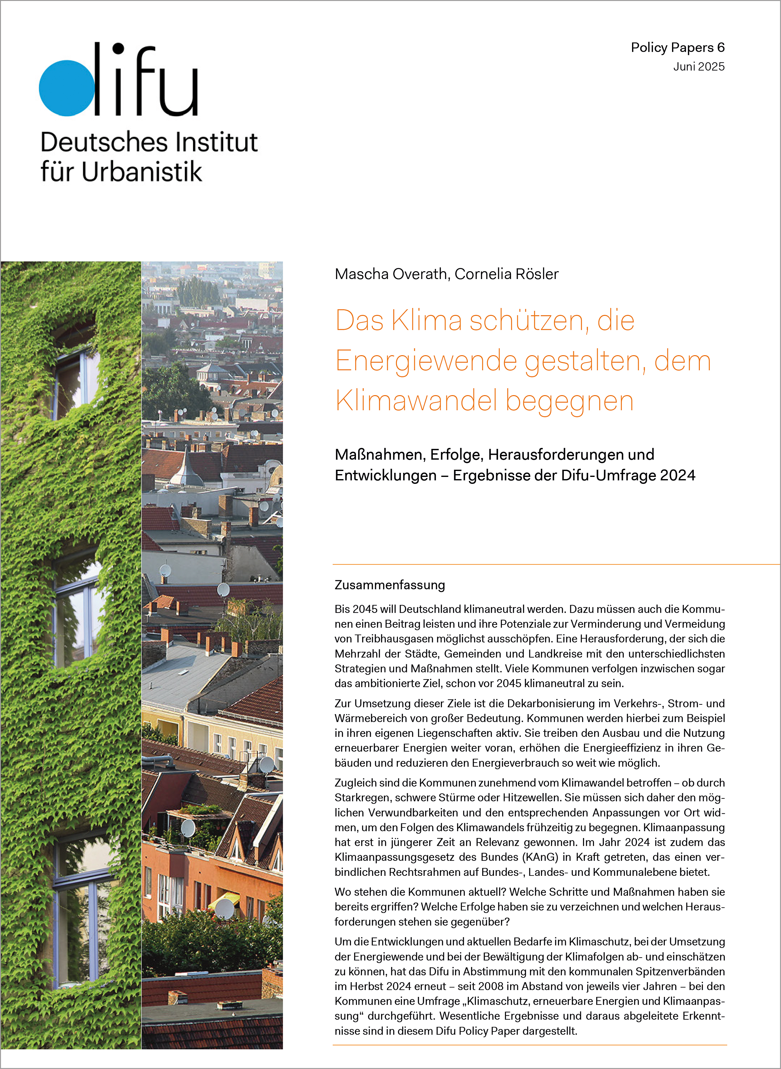 Mit seinem Policy Paper „Das Klima schützen, die Energiewende gestalten, dem Klimawandel begegnen“ stellt das Deutsche Institut für Urbanistik die Umfrageergebnisse aus 296 Kommunen vor und gibt Empfehlungen. Das Paper steht kostenfrei zum Download bereit.