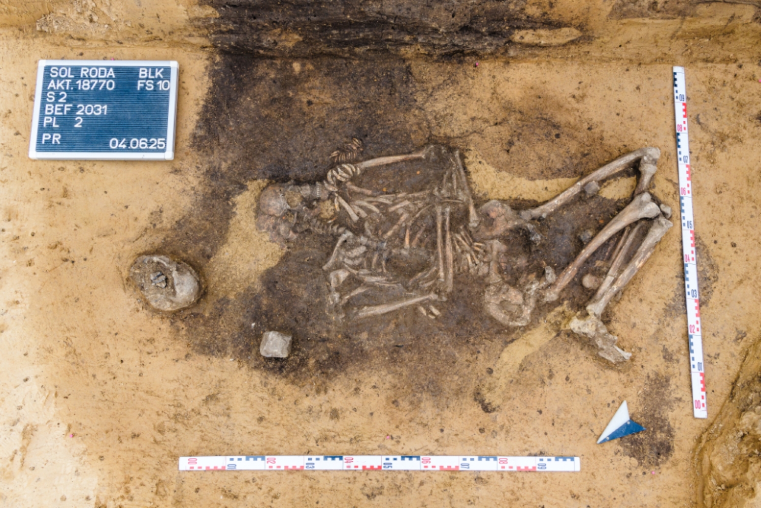 Due to the sightlines created in prehistory, it was possible to see additional burial sites just a few kilometers away, also covered with light-colored loess soil. In total, more than 15 trapezoidal huts from the Baalberg period were uncovered during the SuedOstLink investigations so far. Today, the artificially raised mounds, once several meters high, are no longer visible above ground. Only the foundation ditches of the wooden huts and the burials buried deep in the ground inside them serve as archaeological evidence of beliefs during the Baalberg culture. In any case, with these grave monuments, the people of this period not only honored their ancestors but also visibly expressed their power. Even more than a thousand years later, these symbols attracted the people of the Corded Ware Culture.