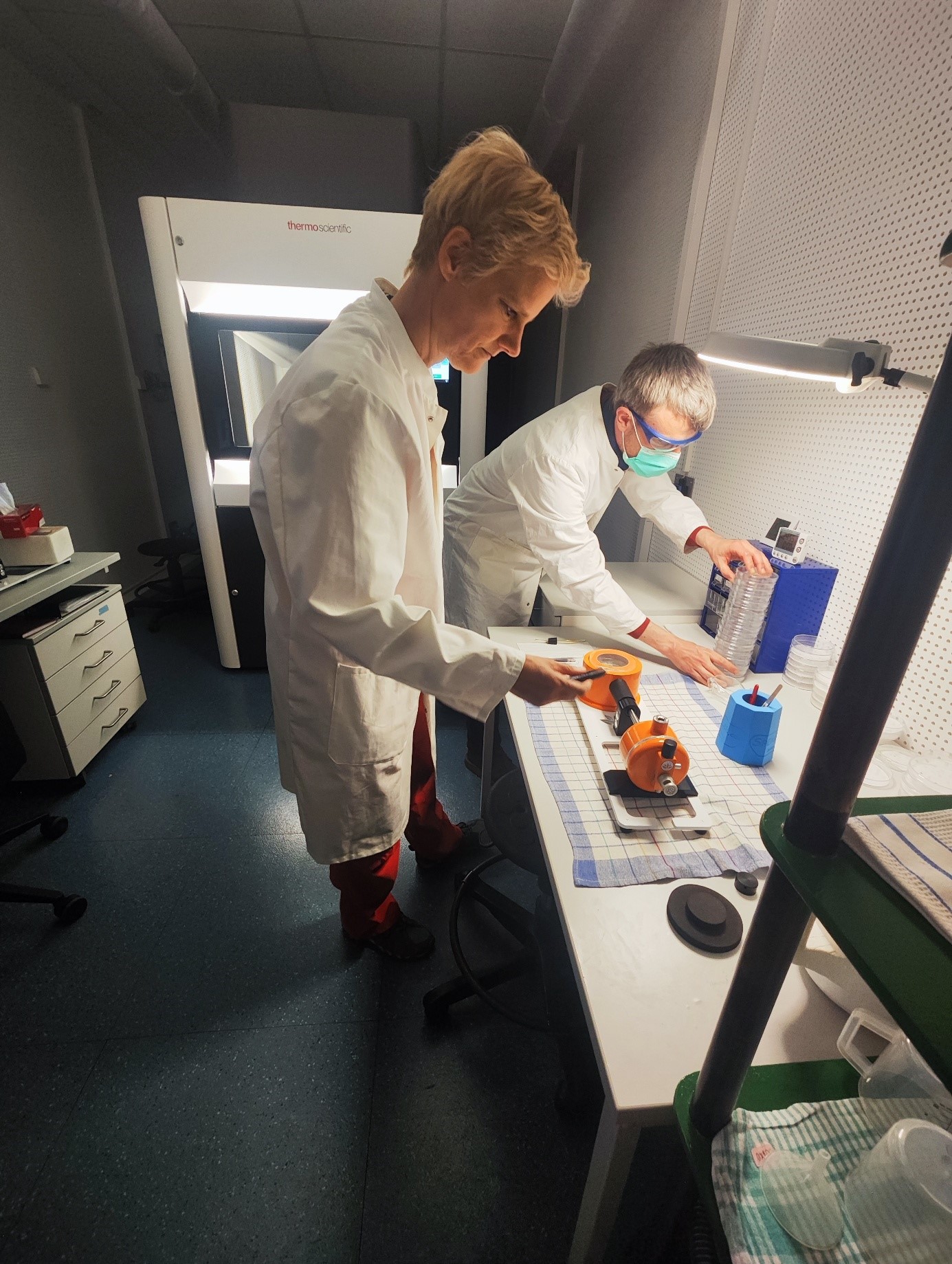 Abbildung 1: Prof. Petra Wendler und Dr. Jakob Ruickoldt bei der Vorbereitung des Probenhalters für die Kryo-Elektronenmikroskopie. Foto: Sophie Reisdorf