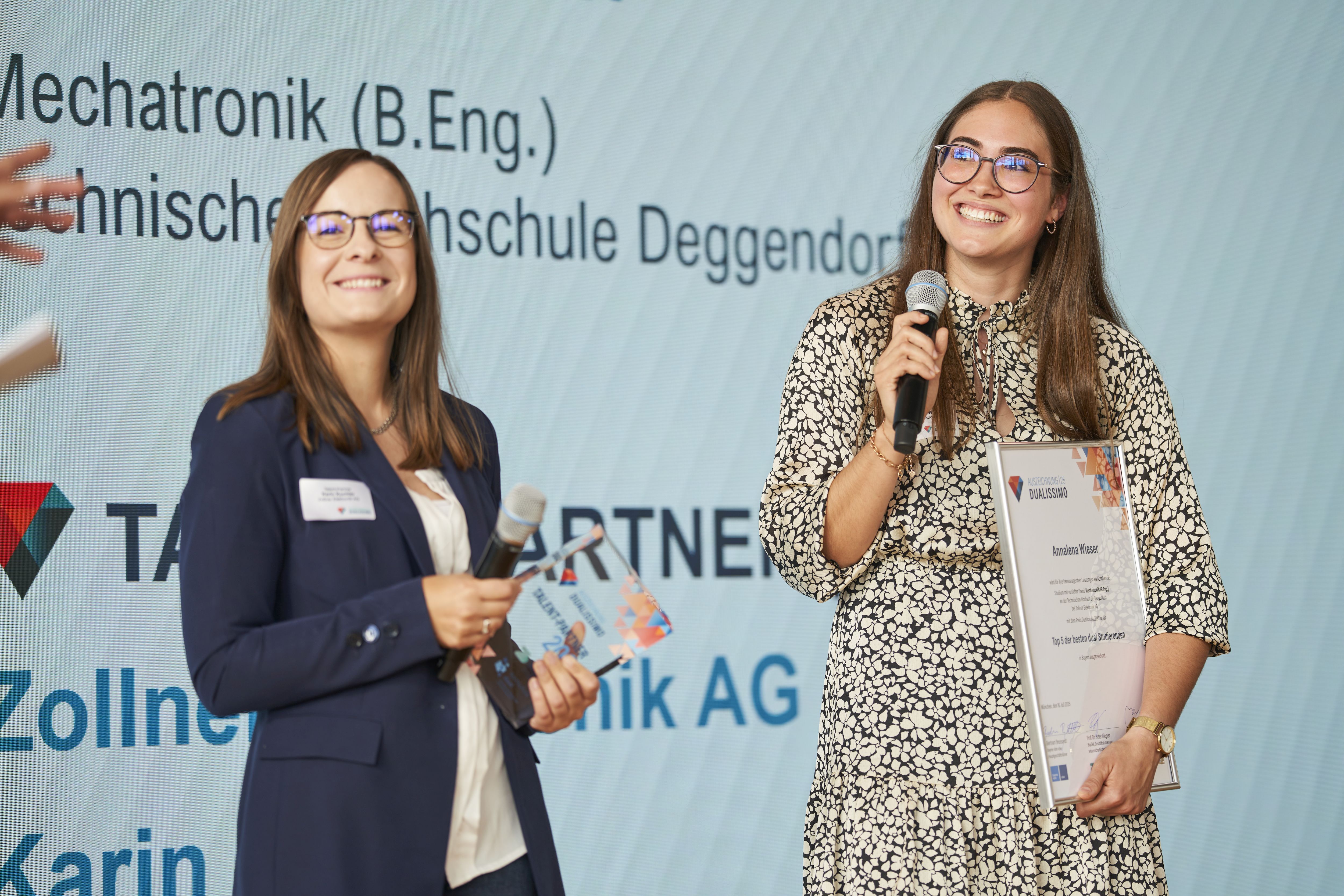 Am 16. Juli wurden die fünf besten Studierenden eines dualen Studiums an einer bayerischen Hochschule für angewandte Wissenschaften mit dem Dualissimo-Preis ausgezeichnet. Unter den Top-5 und damit ausgezeichnete Preisträgerin: Annalena Wieser, duale Mechatronikstudentin an der Technischen Hochschule Deggendorf (THD) bzw. bei der Zollner Elektronik AG. Unter die besten 20 Teilnehmenden schafften es von der THD außerdem Josef Eizenhammer (Elektro- und Informationstechnik/ZF Friedrichshafen AG, Standort Passau) und Johannes Barth (Betriebswirtschaft/ SCS Supply Chain Services AG).