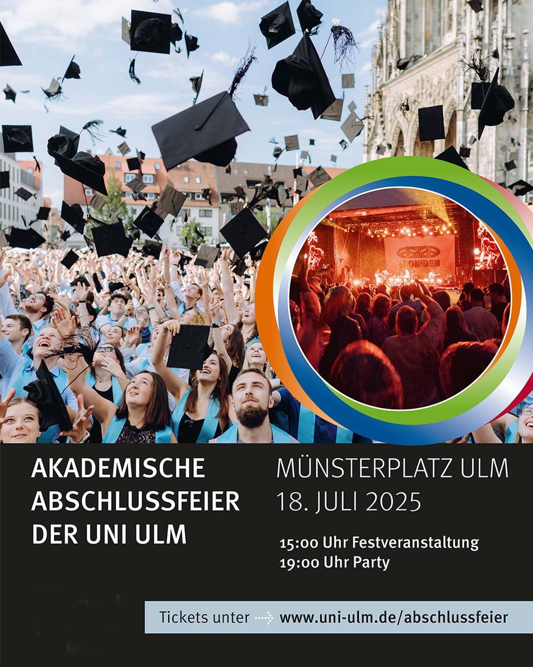 Bei der Akademischen Abschlussfeier ab 15:00 Uhr (Einlass 13:30 Uhr) werden die Absolventinnen und Absolventen des vergangenen Jahres gebührend gefeiert und verabschiedet. Eingeladen sind Absolvierende von Bachelor- und Master-Studiengängen der Uni Ulm und Promovierende sowie alle Angehörigen und interessierte Ulmerinnen und Ulmer.