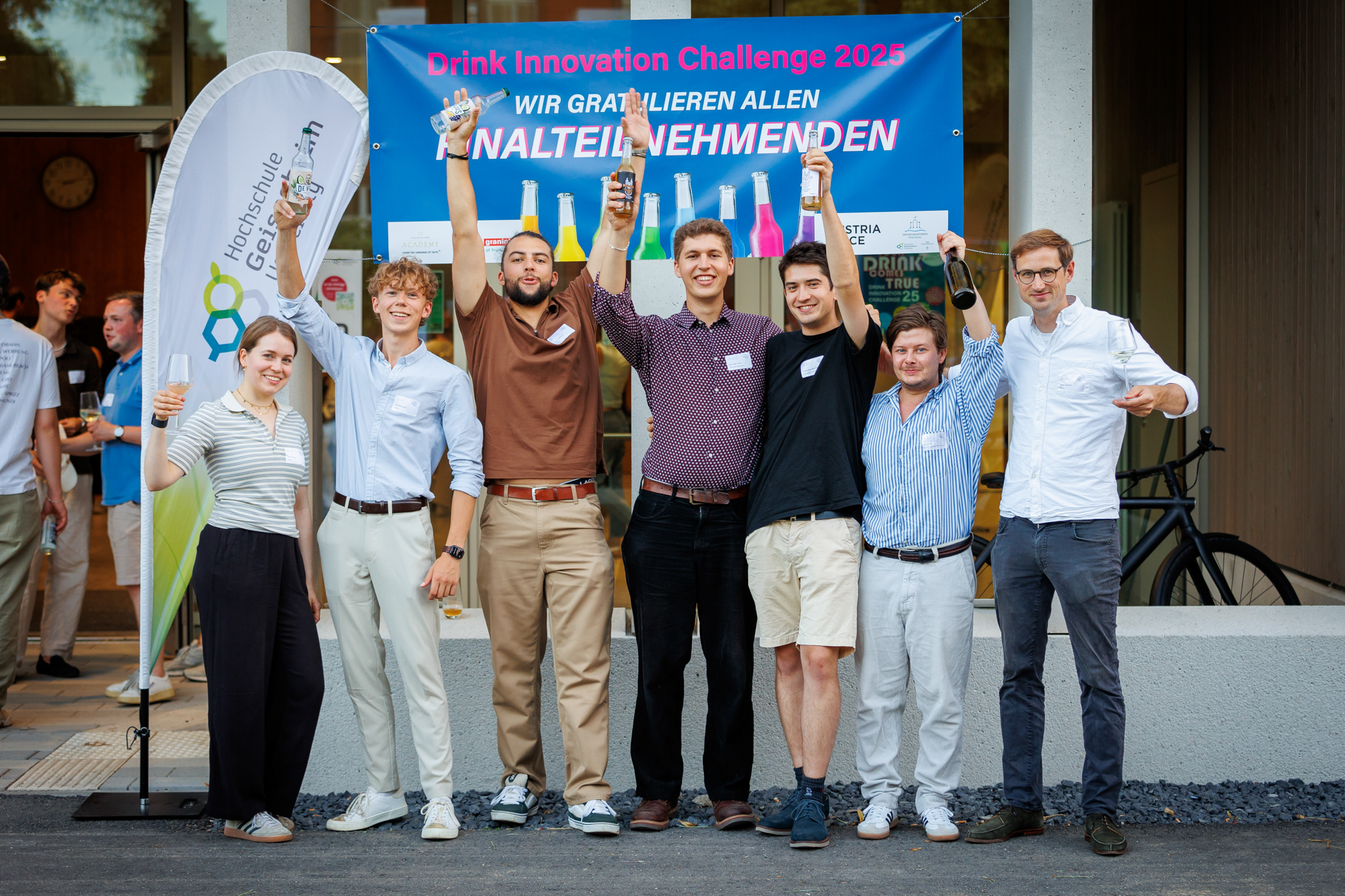 Neben der zehnköpfigen Jury aus Industrie, Medien, beruflicher und akademischer Lehre fanden sich Ende Juni rund 130 Gäste im großen Hörsaal der Hochschule ein, um sich einen direkten Eindruck der Final-Ideen zu verschaffen. Auch das Publikum war aufgefordert, die einzelnen Kreationen anhand verschiedener Kriterien zu bewerten. Neben der Idee selbst spielten hierbei Aspekte wie Nachhaltigkeit, Marktchancen und Innovationsgrad eine Rolle. Die Juror:innen konnten zusätzlich alle Getränke probieren, um sich einen sensorischen Eindruck der Produkte zu machen.