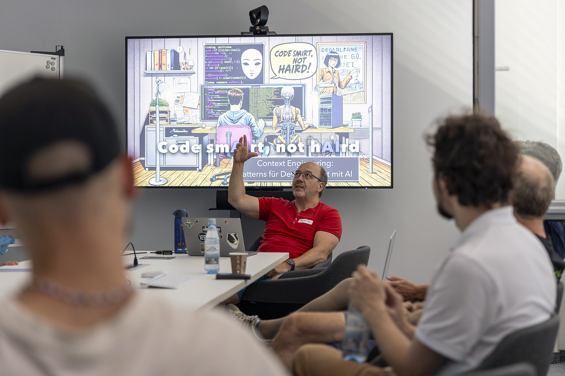 Vom erfahrenen Entwickler bis zum KI-Neuling war für alle etwas dabei: Praktische Anleitungen wie „Prompting like a Pro – create your social media post in 2 min instead of 30 min“ bis zu technischen Deep-Dives wie „RAG, LLMs, Vector Storage, Embeddings“. Auch gesellschaftliche Fragestellungen wurden kontrovers diskutiert, darunter „Wenn KI über Karriere entscheidet“. Prof. Dr. Frank Deinzer vom CAIRO nutzte das Format für eine Session zu Promotionsmöglichkeiten an der THWS und führte noch während der Veranstaltung zahlreiche Gespräche mit Interessierten.