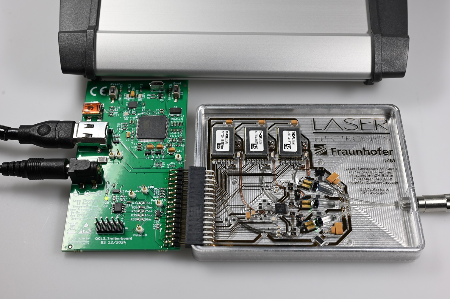 Durch das neuartige Aufbaukonzept, bei dem jeder der QCLs in einem temperaturstabilisierbaren Hohlraum im Glas sitzt, können die eng beieinander liegenden Laser unabhängig voneinander in ihrer Temperatur und damit in der Wellenlänge eingestellt und stabilisiert betrieben werden. Die integrierten elektronischen Treiber und Regelkreise sind mit industriellen Lötprozessen auf einer dünnfilm-metallisierten Glasplatine angebracht – die mittels selektiver Laserätzung im µm-Bereich so strukturiert ist, dass auch die optischen Komponenten direkt einbestückt werden können. Der hohe Integrationsgrad ermöglicht es, das gesamte System zu verkapseln. Dadurch kann es auch in rauen Umgebungen eingesetzt oder im Rahmen von Medizinanwendungen desinfiziert werden.