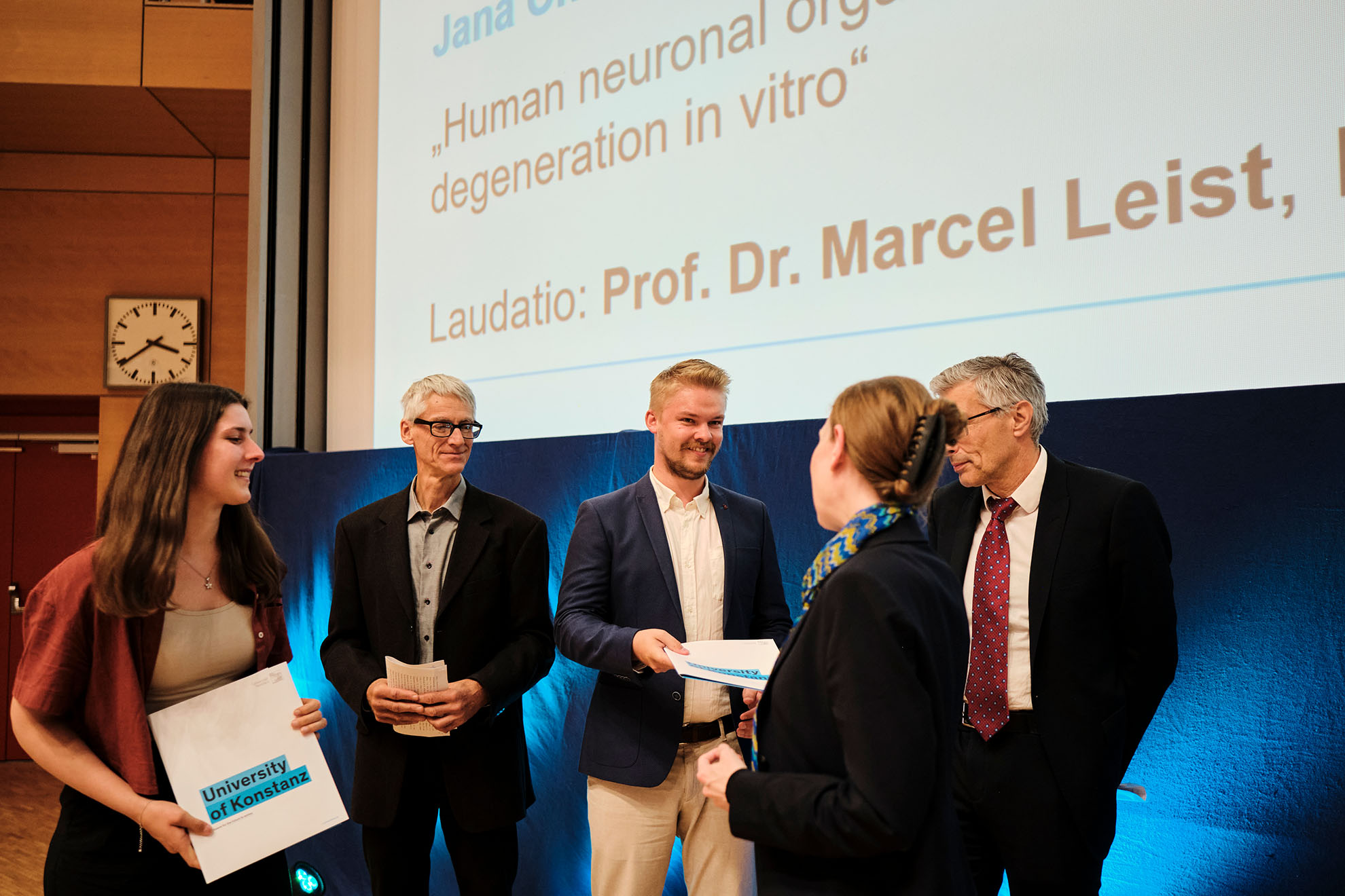 Basierend auf Forschungsarbeiten der Arbeitsgruppe für In-vitro-Toxikologie und Biomedizin erstellte und erprobte Jana Molz ein Modell dreidimensionaler neuronaler Gewebe, die menschlichen Spinalganglien ähneln. Diese können verwendet werden, um die Mechanismen der Neurodegeneration, -protektion und -rehabilitation genauer zu untersuchen und tierversuchsfreie Experimente auf dem Gebiet durchzuführen. Prof. Dr. Marcel Leist, der die Laudatio hielt, betonte: „Die Ergebnisse stellen für uns einen Durchbruch dar, da wir erstmals einen überzeugenden langen Schutz von Nervenausläufern sehen konnten, und auch der Weg zu weiteren Experimenten zur Regeneration geschädigter Ausläufer vorgezeichnet wurde.“ Die Entwicklung neuer Medikamente in diesem Forschungsfeld verläuft bislang langsam, da geeignete Testmodelle fehlen. Die Arbeiten von Frau Molz könnten diese Situation maßgeblich verbessern.