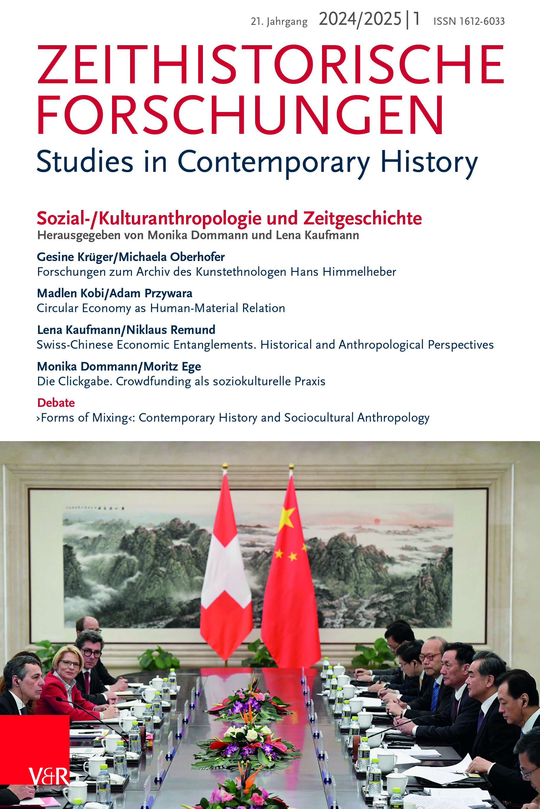 Die Beiträge des Themenheftes, zum Teil verfasst von Autor:innen-Tandems beider Fächer, verdeutlichen Potentiale und Ergebnisse gemeinsamen Forschens. Ein Aufsatz über den deutschen Ethnologen Hans Himmelheber (1908–2003) zeigt mit umfangreichem Bildmaterial, wie historische Dokumente, Filme, Fotos und Objekte vor allem aus der heutigen Côte d’Ivoire und der Demokratischen Republik Kongo neu befragt werden können. Wissenschaftliche und künstlerische Forschung, afrikanische und europäische Perspektiven treten hier in einen produktiven Austausch. Ein anderer Aufsatz widmet sich der Wiederverwendung von Baumaterialien in Polen nach dem Zweiten Weltkrieg und in der heutigen Kreislaufwirtschaft in Österreich. Aus der Verbindung dieser sehr unterschiedlichen Kontexte ergeben sich neue Erkenntnisse etwa über den Wert manueller Arbeit. Weitere Themen sind die chinesisch-schweizerischen Wirtschaftsbeziehungen (von den 1970er-Jahren bis heute) sowie die noch relativ neue Praxis des Crowdfunding. Am Beispiel eines Schweizer Crowdfunding-Anbieters wird gezeigt, dass zunächst einmal ausgehandelt werden musste, was Crowdfunding in rechtlicher, wirtschaftlicher, politischer, sozialer Hinsicht überhaupt ist und wie es sich von früheren Formen des Spendens unterscheidet. Einer der Gründer der untersuchten Start-up-Firma hatte zuvor Geschichte und Ethnologie studiert – eine eher zufällige, für das Themenheft aber gut passende Pointe.
