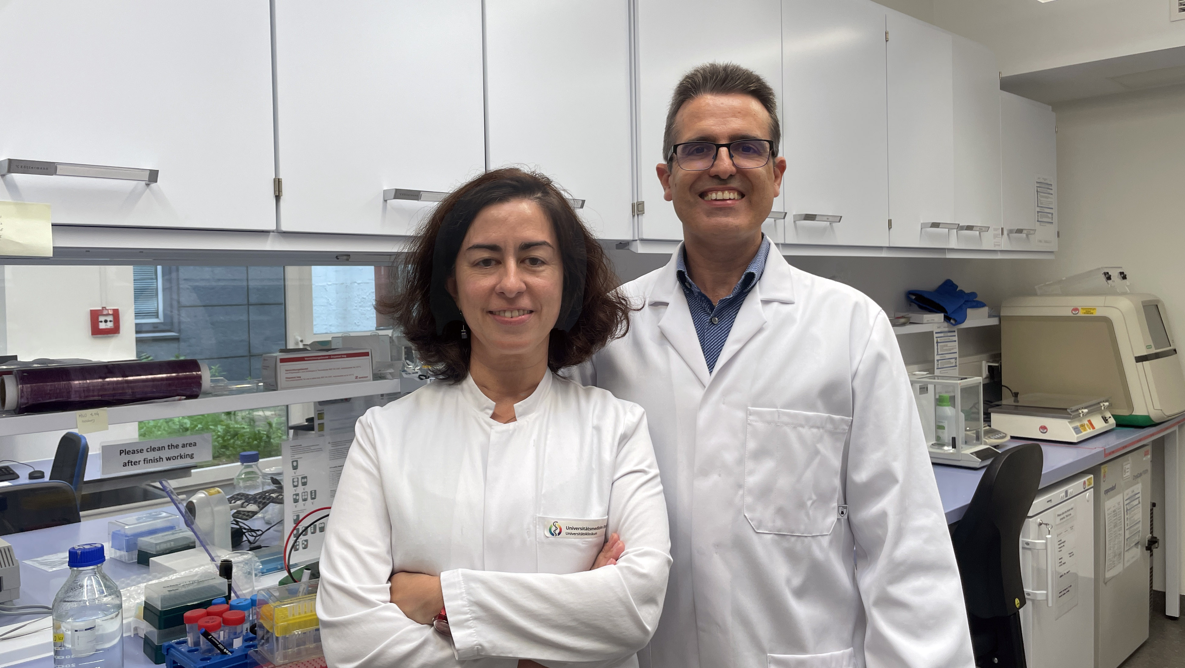 Dr. Samuel Peña-Llopis, Leiter der Arbeitsgruppe für Translationale Genomik in der Klinik für Augenheilkunde, und Dr. Silvia Vega Rubin de Celis, Leiterin der Gruppe Autophagie bei Krebs am Institut für Zellbiologie (Tumorforschung), entdeckten, dass BAP1-Mutationen das Protoonkogen SRC aktivieren und die Autophagie stören, also den Selbstreinigungsprozess der Zellen. In Laborversuchen und in Organoiden – organähnlichen Tumormodellen von Patient:innen – konnten sie diesen Effekt gezielt beeinflussen.