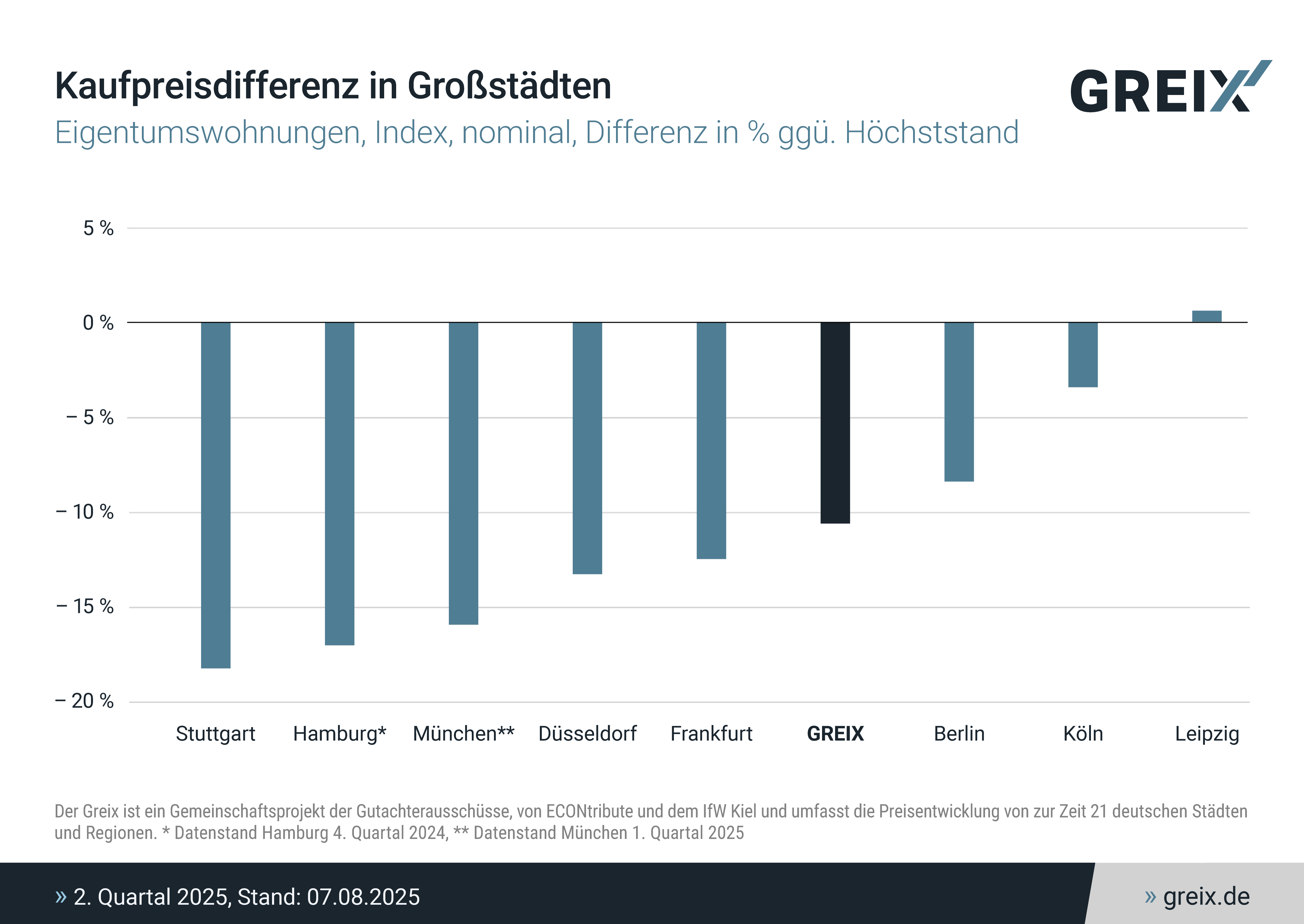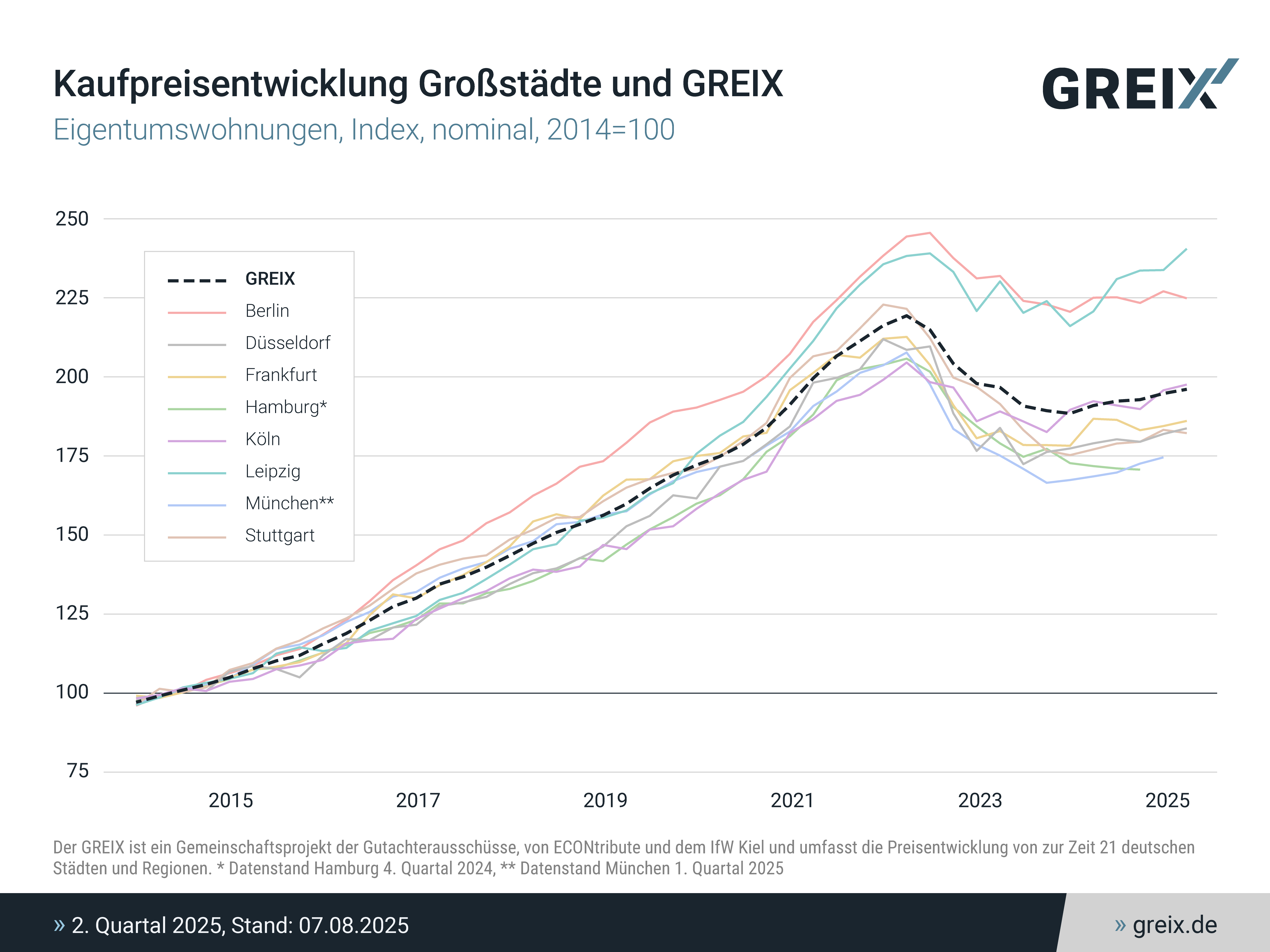 Das geht aus der aktuellen Auswertung des German Real Estate Index (GREIX) hervor, ein Gemeinschaftsprojekt der Gutachterausschüsse für Grundstückswerte sowie von ECONtribute und dem Kiel Institut für Weltwirtschaft.