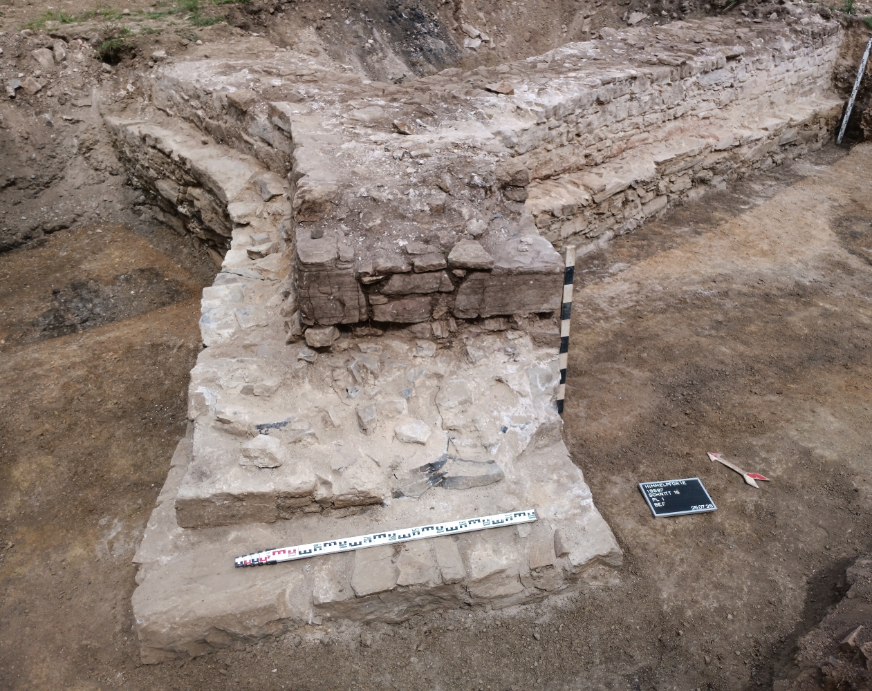 Similar pillars are found in the building later added to the south of the church, which we preliminarily associate with St. Catherine's Chapel, first mentioned in writing in 1478, which was also intended to house the monastery library. To the north, the three-winged enclosure complex adjoined the church. Its cloister surrounded a small courtyard that only approximated the usual rectangle shape. The reason for the enclosure's asymmetrical floor plan is unknown. Other buildings also raise questions, such as a semicircular, conch-like foundation structure on the north wall of the church that protrudes into the cloister. Possibly this can be interpreted as a niche for a side altar. The excavation sections through the north and east wings of the enclosure also provide detailed insights into the building's design and history where geophysical surveys had not provided a clear picture.