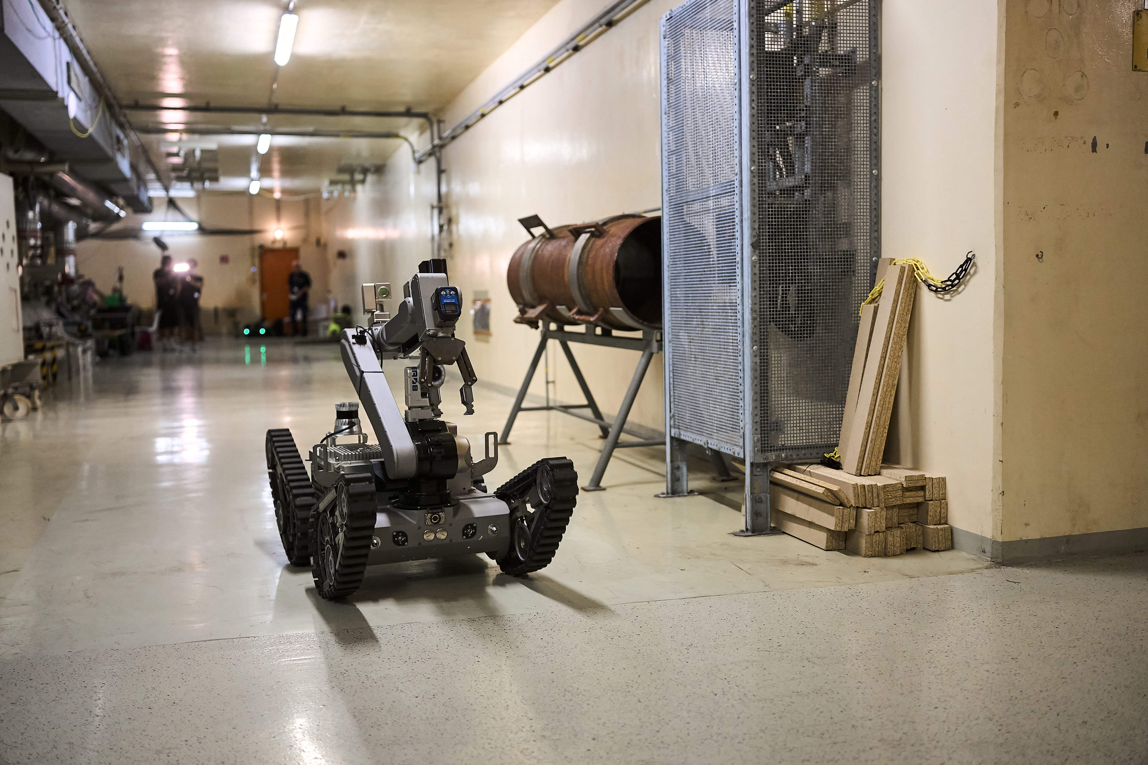 Exakt fünf Quellen sind es in diesem Jahr, doch das wissen die Teams bei ihren jeweils 30-minütigen Durchgängen nicht. Rund 40 Kameras haben jeden Winkel des Hackathon-Areals im Blick – jeden Gang, jede Kurve, die gut verborgenen Strahlenquellen, die mehr als 50 Meter hohe Maschinenhalle, die die Drohnen erkunden sollen, und die beiden schweren Stahltüren, hinter denen die Dummy-Puppen für die Kategorie „Search & Rescue“ abgelegt sind.