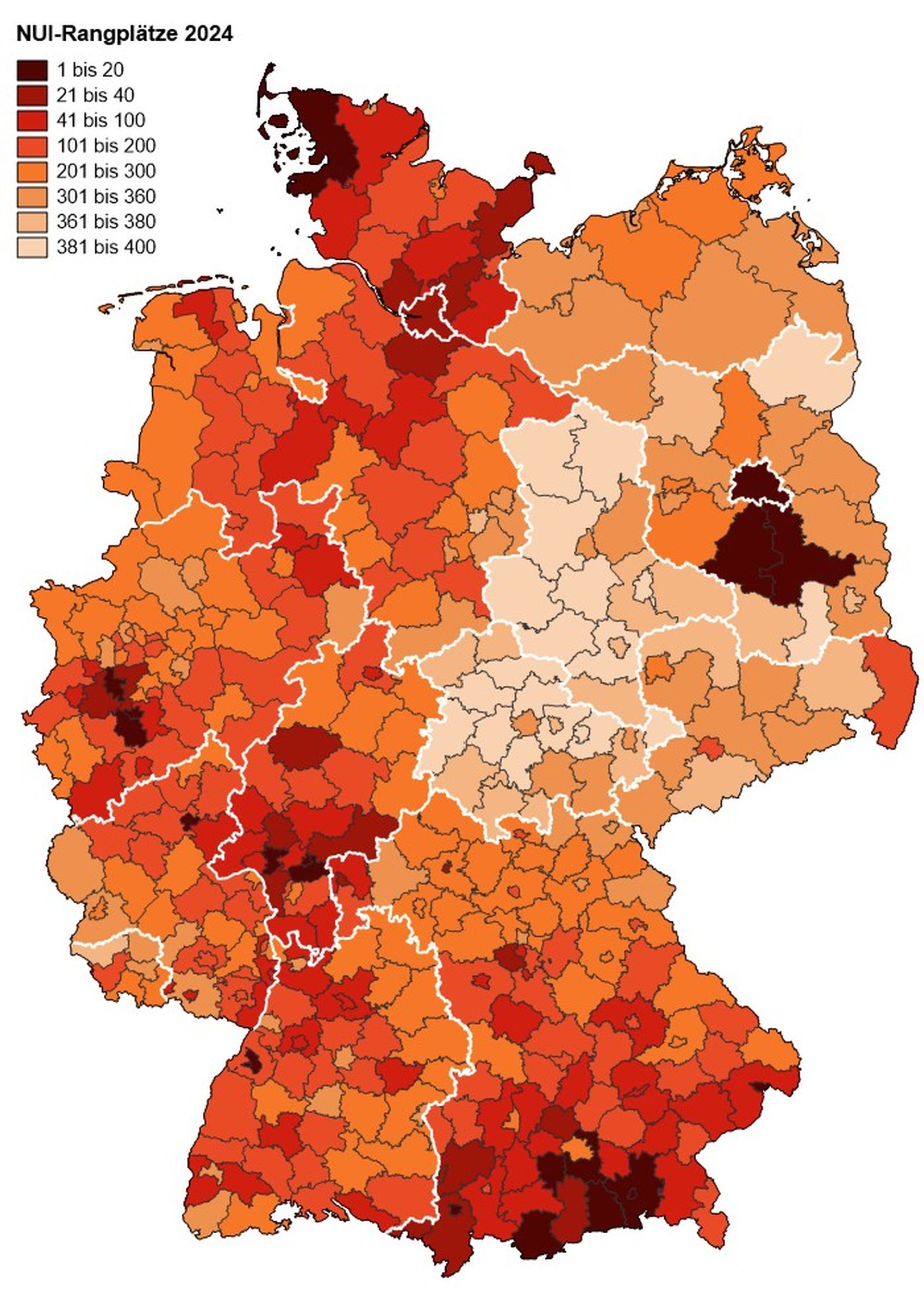 Innerhalb eines Bundeslandes kann der NUI-Indikator stark divergieren: So finden sich zwar in Bayern acht Kreise in der NUI-Spitzengruppe, andere Kreise dieses Bundeslandes liegen dagegen in der unteren Hälfte des bundesweiten Rankings.