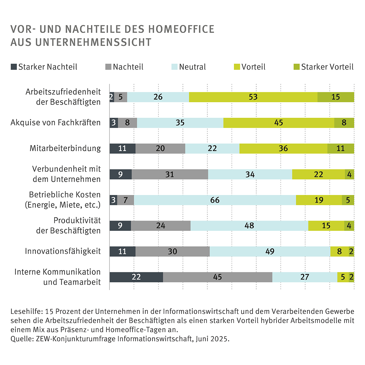 „Mit Homeoffice-Angeboten können vielfältige Effekte einhergehen. Besonders positiv bewerten Unternehmen die Wirkung auf die Arbeitszufriedenheit von Beschäftigten. Rund zwei Drittel der Unternehmen sehen hier einen Vorteil von hybriden Homeoffice-Angeboten mit einem Mix aus Präsenz- und Homeoffice-Tagen“, so Erdsiek. „Darüber hinaus berichten mehr als die Hälfte der Unternehmen, dass hybride Modelle das Anwerben von Fachkräften erleichtern.“