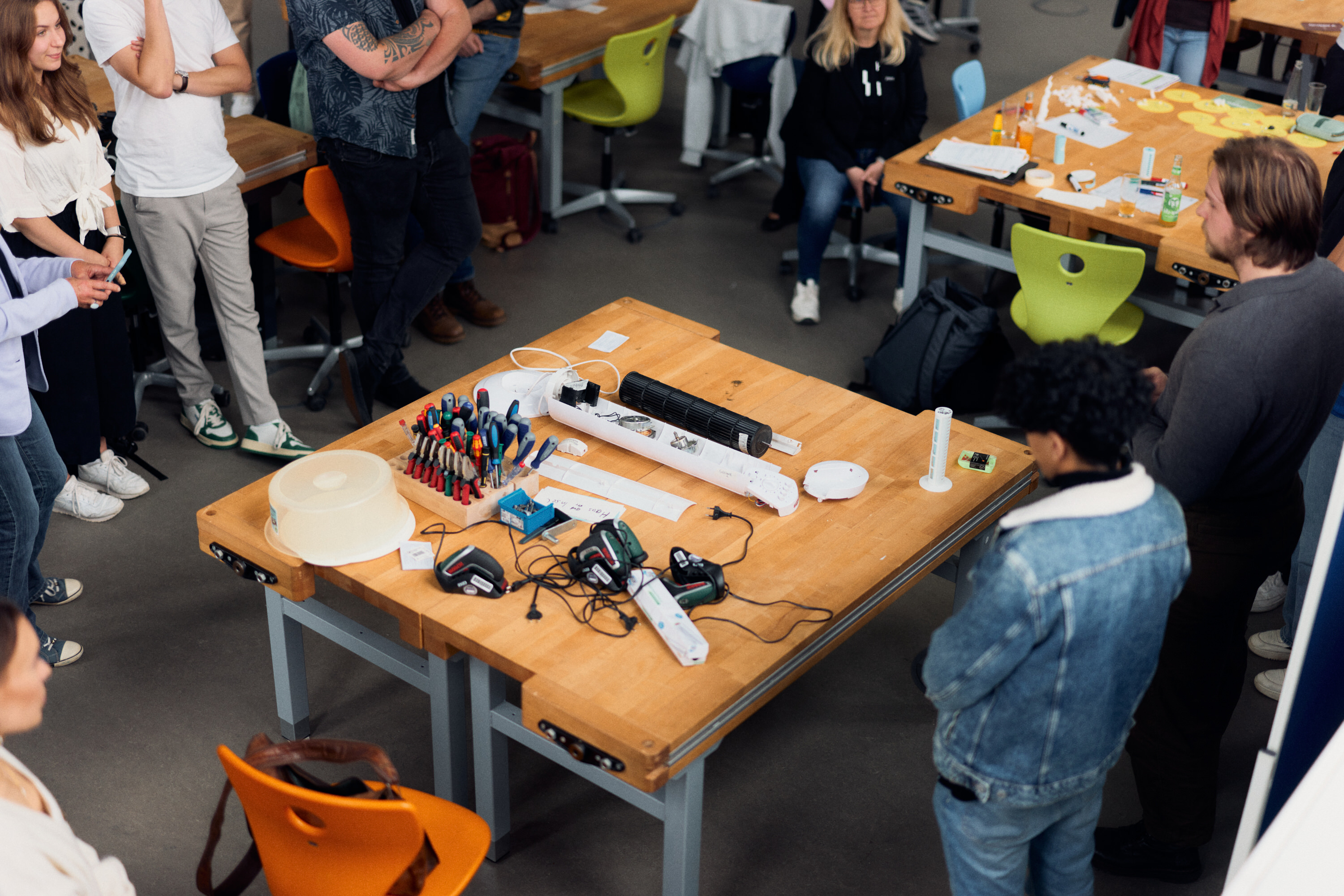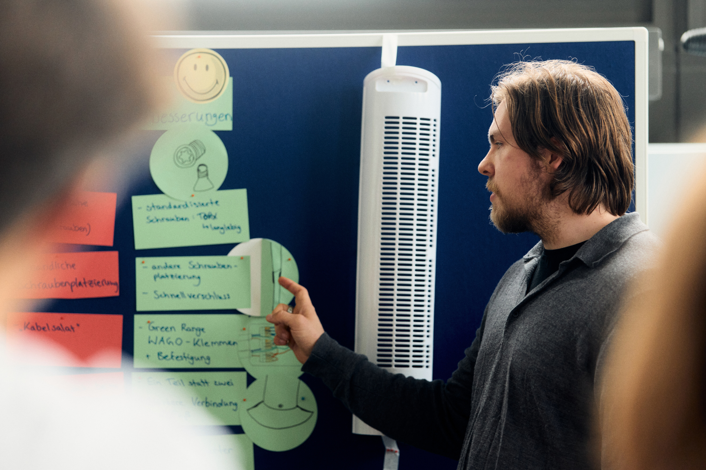 Damit der Kunde einen Schaden an dem Gerät selber beheben kann, bedarf es nur weniger Veränderungen. Dazu zählt die Verwendung von Torx-Schrauben, die nicht so schnell abnutzen, ebenso wie der Einbau besserer Kabel und moderner Klemmen. „Wir denken dabei vor allem an Green Range WAGO-Klemmen“, sagt Nils Jasper, ebenfalls Mitglied in der Lüfter-Gruppe. „Und wir haben uns überlegt, den Rotor aus Aluminium statt aus Plastikfertigen zu lassen.“ Das sei zwar teurer, aber im Endeffekt eindeutig langlebiger.