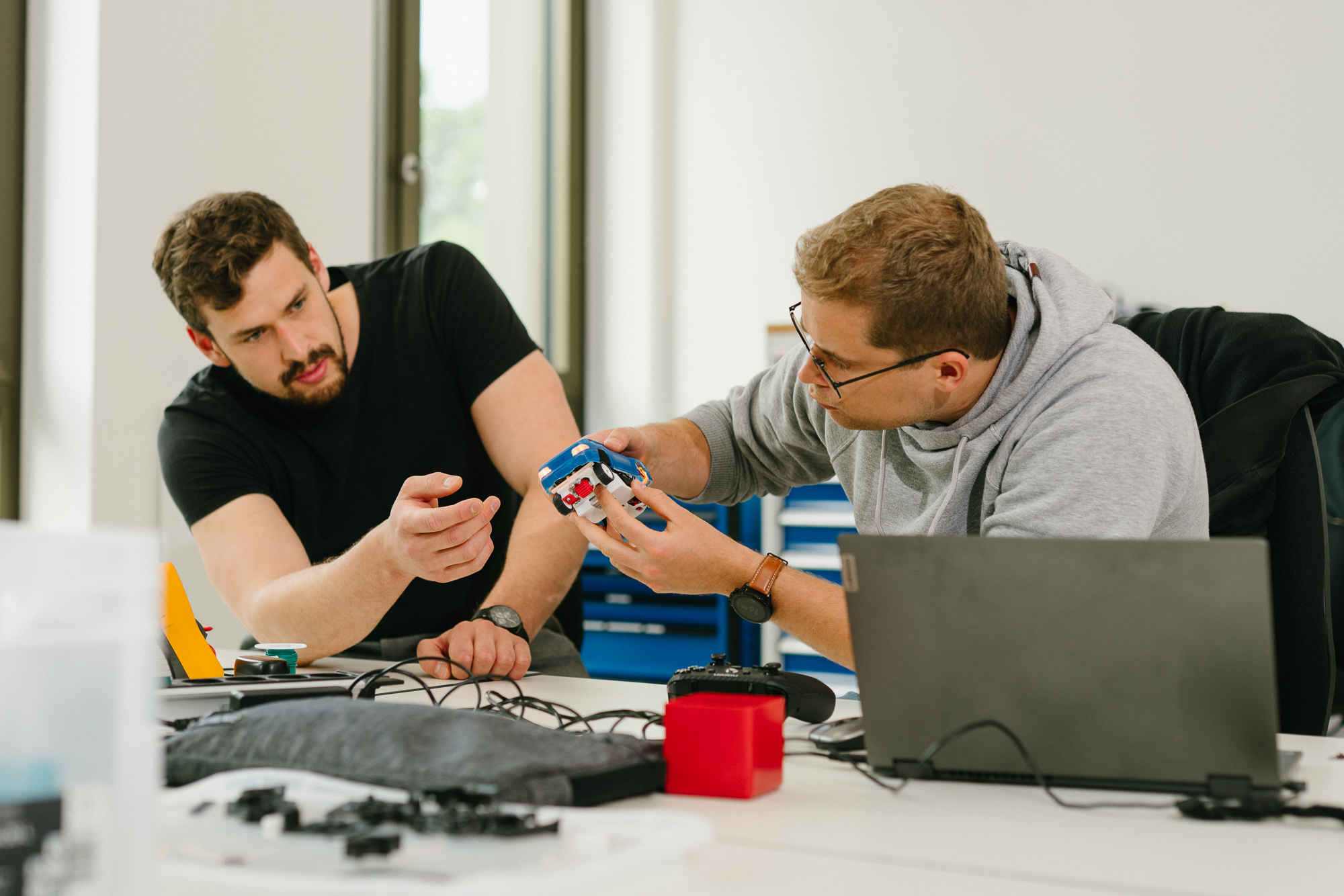 Als Controller war ein ESP32-Wroom Mikrocontroller gesetzt. Er übernimmt die elektrische Ansteuerung der Aktoren des Rennwagens, also Antriebs- und Lenkungssystem. „Der Controller ist die Funkschnittstelle zum Fahrzeug, er überträgt die Anweisungen des Steuerungsprogramms auf die Aktoren und sorgt dafür, dass sich das Fahrzeug effizient und präzise auf dem errechneten Pfad bewegt“, erklärt Philip Wette. Egal, wo der Wagen gestartet wird: Eine Fish-eye-Kamera über der Rennstrecke erkennt das Fahrzeug und seine Bewegung, die Informationen werden zur Errechnung der optimalen Rennlinie in Echtzeit verwertet. „Dazu braucht es ein mathematisches Modell des Fahrzeugs. Wo befindet es sich? Wo soll es hin?“, skizziert Wette die Aufgabe der Pfadplanung. Die Studierenden imitieren dabei die Fahrersicht. „Als ob sie selbst im Fahrzeug sitzen und auf Sicht fahren würden. Sehen sie eine Kurve, lenken sie entsprechend.“ An der Rennstrecke schießt das Fahrzeug soeben über den Rand der Platte hinaus – und wird blitzschnell von den Studierenden aufgefangen. „Puh.“ Mattis Schrade am Rechner diagnostiziert: „Der Zielpunkt wird noch nicht sicher erfasst, der Algorithmus hat Probleme damit.“ Er ändert einige Parameter, jetzt hoppelt der Rennwagen quer über den Grünstreifen zwischen der Rennstrecke. „Immer noch etwas betrunken.“ Die Software-Entwicklung hat die zeitlichen Abhängigkeiten innerhalb des interdisziplinären Projekts besonders zu spüren bekommen. „Wir können das Programm ja erst testen, wenn ein fahrbares Fahrzeug fertig ist“, beschreibt Schrade das Problem. „Also jetzt.“