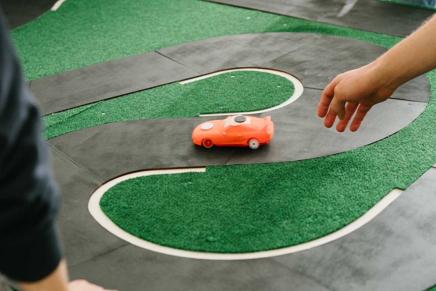 Minden (hsbi). Gespannt stehen die Studierenden um eine Art Tischplatte herum. Zwischen grünem Filz schlängelt sich ein breites, graues Band ins Runde: eine Rennstrecke. Darauf in signalfarbenem Orange ein kleines Auto. Mattis Schrade tippt etwas am Computer ein – und der Wagen setzt sich in Bewegung. Wird schneller, schlingert ein bisschen hin und her, dreht aber schließlich eine gesamte Runde. Die Studierenden sind begeistert. „So gut hat das noch nie geklappt“, freut sich Schrade.