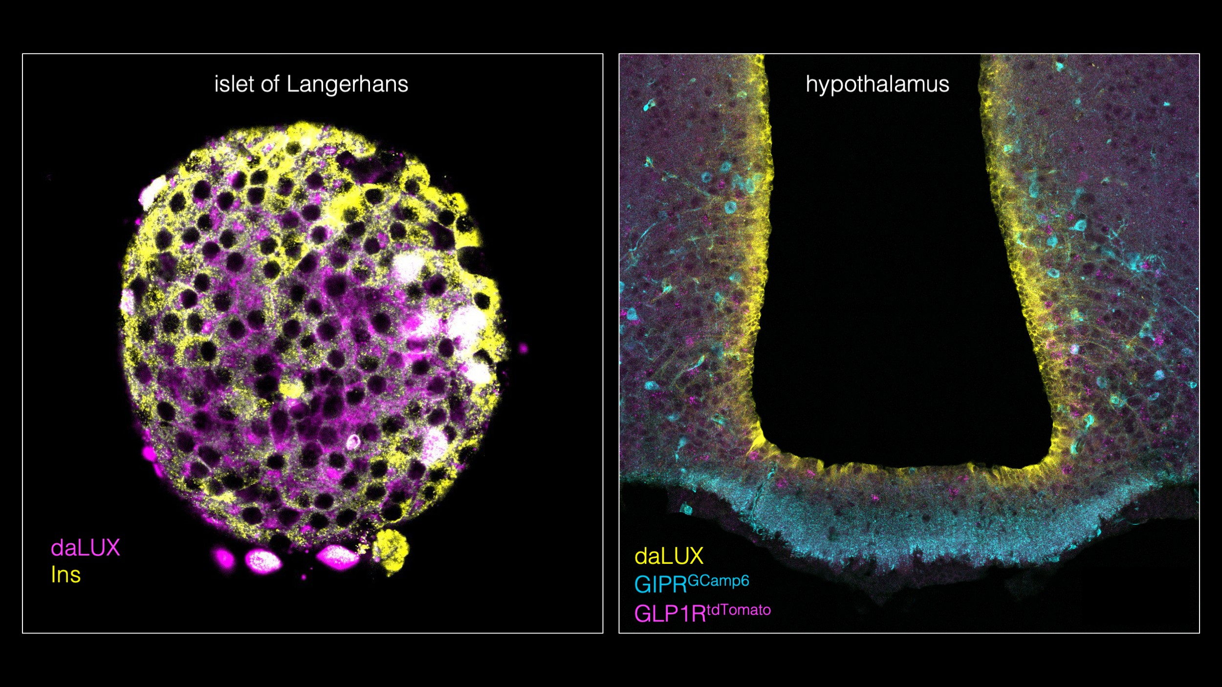 Übliche Methoden wie Antikörper reichen zum Nachweis nicht aus, weil sie teilweise nicht validiert sind, oder nicht mal gegen ein spezifisches Protein erhältlich sind. Außerdem liefern sie keine Antworten darauf, wie und wo Medikamente an der Bauchspeicheldrüse und im Gehirn wirken. „Uns interessiert vor allem die Dynamik der Peptide“, sagt Johannes Broichhagen. Durch Versuche mit daLUXendinen konnte gezeigt werden, dass die Marker am stärksten an Betazellen, aber auch an Alpha- und Deltazellen in der Bauchspeicheldrüse binden. Zudem konnte nachgewiesen werden, dass Tirzepatid auch spezifische Hirnregionen und Nervenzellen erreicht, die für die Steuerung von Appetit und Stoffwechsel wichtig sind. Eine besonders interessante Entdeckung war die Markierung von Tanyzyten, speziellen Zellen im Gehirn, die den Stoffwechsel überwachen und Signale an Esszentren senden.