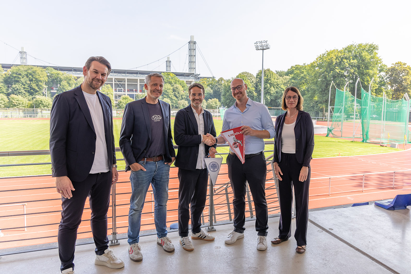 Gruppen-Foto: v.l.: Thomas Kessler (FC-Sportdirektor), Philipp Türoff (FC-Geschäftsführer Finanzen und Administration), Philipp Liesenfeld (FC-Geschäftsführer Marketing und Vertrieb), Prof. Tobias Vogt (DSHS-Prorektor Forschung und Transfer ), Prof.‘in Bettina Rulofs (DSHS-Prorektorin Studium, Lehre und Weiterbildung).