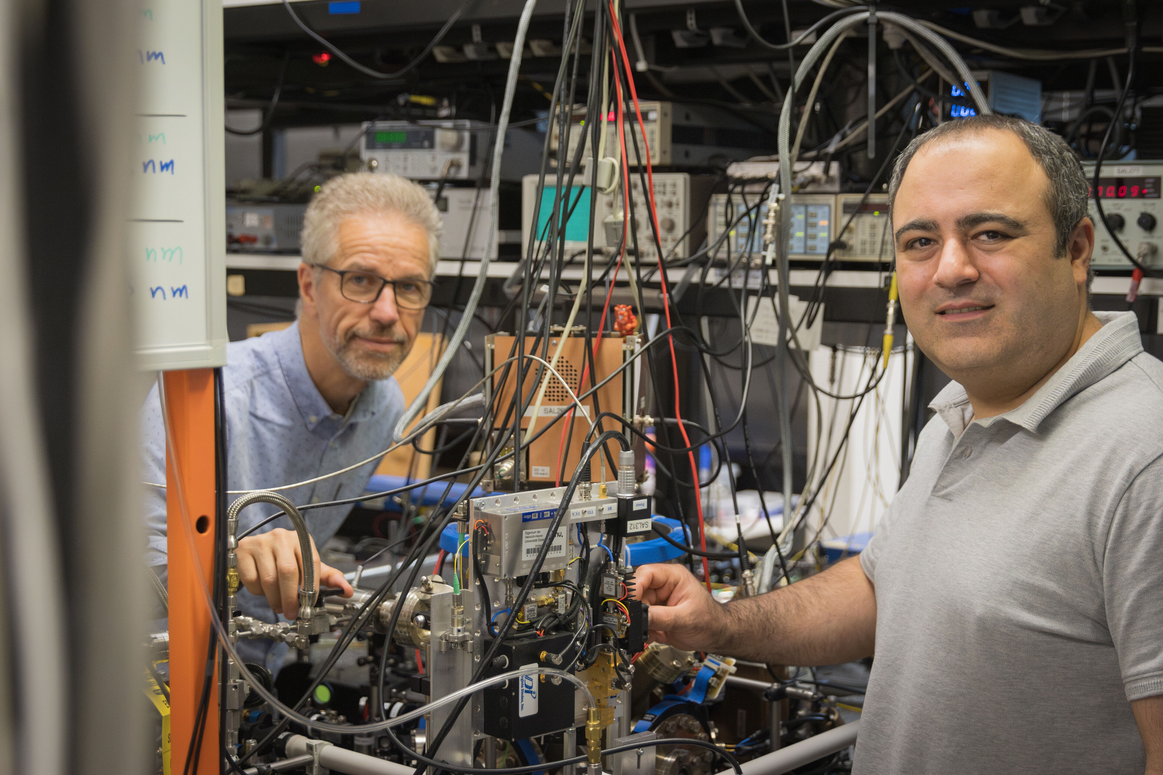 „Wir fangen Molekülionen zusammen mit Atomionen, die mit Lasern kühlbar sind, in einer Falle zusammen ein“, erläutert Alighanbari den Düsseldorfer Ansatz: „Die kalten Atome kühlen die Moleküle mit ab und verlangsamen so deren Bewegung drastisch. Doch da reicht dies noch nicht ausreichte, um die Dopplerverbreiterung vollständig zu eliminieren, wählten wir eine spezielle Spektroskopiegeometrie, mit der dies möglich wurde.“