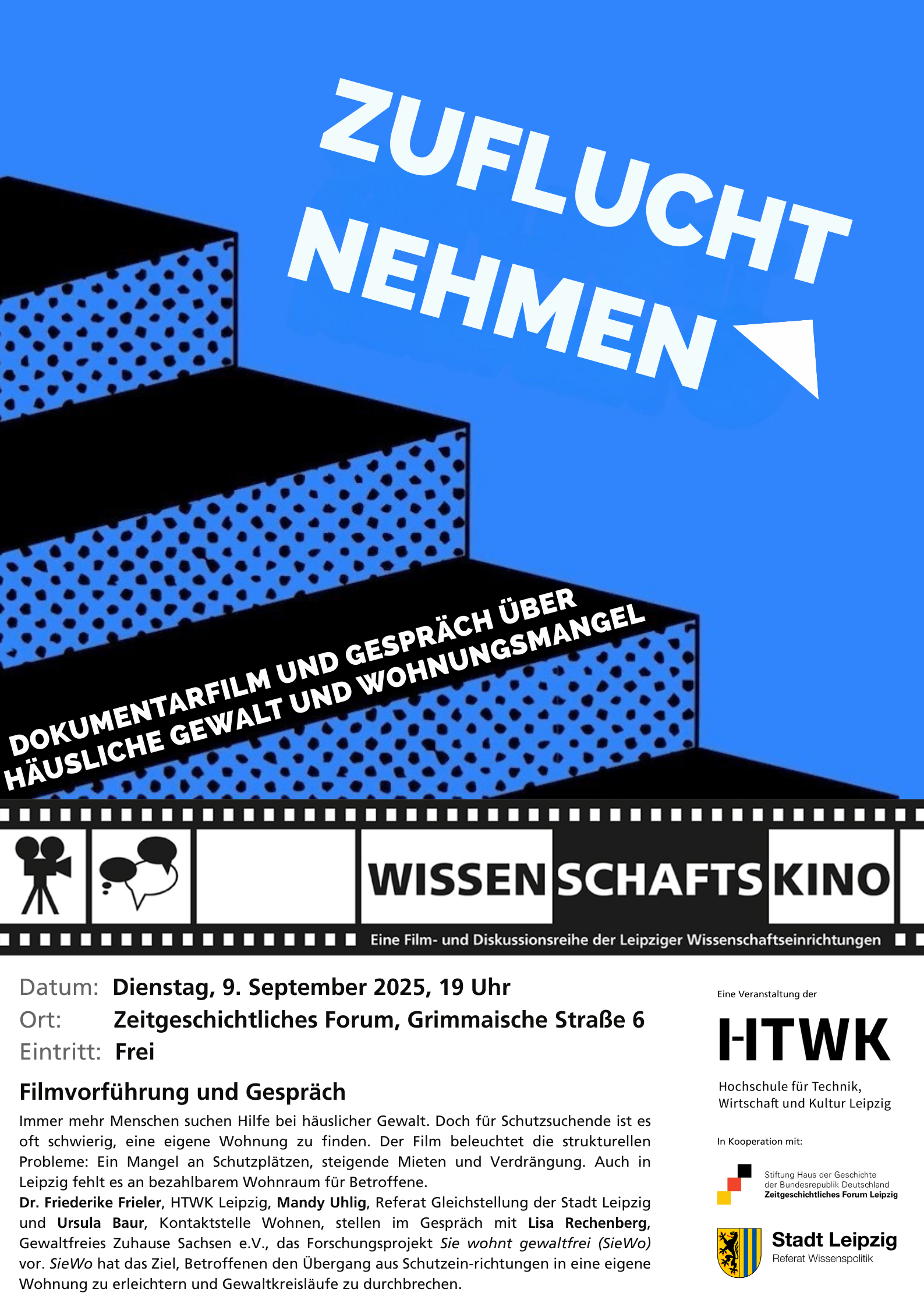 Über diese drängenden gesellschaftlichen Probleme sprechen am 9. September 2025 HTWK-Forscherin Dr. Friederike Frieler und weitere Gäste im Zeitgeschichtlichen Forum Leipzig nach dem Film „Zuflucht nehmen“.