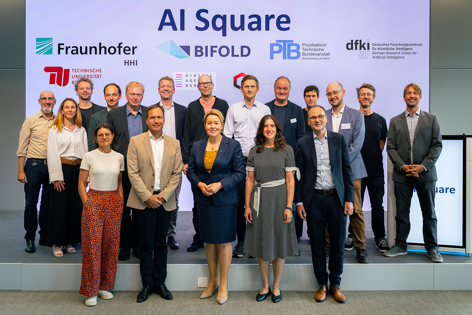 Im Rahmen ihrer diesjährigen Sommertour besuchte die Berliner Wirtschaftssenatorin Franziska Giffey am 3. September 2025 das Berlin Institute for the Foundations of Learning and Data (BIFOLD) an der TU Berlin, um sich über die Weiterentwicklung des Institutes und vor allem dessen erfolgreichen Kooperationen mit der Berliner Wirtschaft zu informieren. BIFOLD Co-Direktor Prof. Dr. Klaus-Robert Müller nutzte die Gelegenheit, um die Senatorin über wesentliche Forschungsschwerpunkte und -erfolge des Instituts zu informieren und stellte ihr einige BIFOLD-Ausgründungen sowie BIFOLD-Kooperationspartner aus der Berliner Wirtschaft vor. Der zweite Teil der Veranstaltung war dem „Berlin AI Square“ am Salzufer gewidmet: Mit BIFOLD, dem DFKI, dem Fraunhofer Heinrich-Hertz-Institut (HHI), der Physikalisch-Technischen Bundesanstalt (PTB) und weiteren KI-Forschungseinrichtungen entsteht hier auf engstem Raum eine relevante und sich gegenseitig ergänzende Ansammlung von KI-Spitzenforschung – bestens vernetzt mit Transfereinrichtungen für die Förderung von Ausgründungen, sowie den zahlreichen KI-Industrie-Unternehmen, die sich in Berlin angesiedelt haben. „In Berlin tragen die Stärke, Vielfalt und das internationale Renommee der KI-Forschung unmittelbar zur Innovationskraft und Wettbewerbsfähigkeit unserer Stadt bei“, so die Senatorin.
