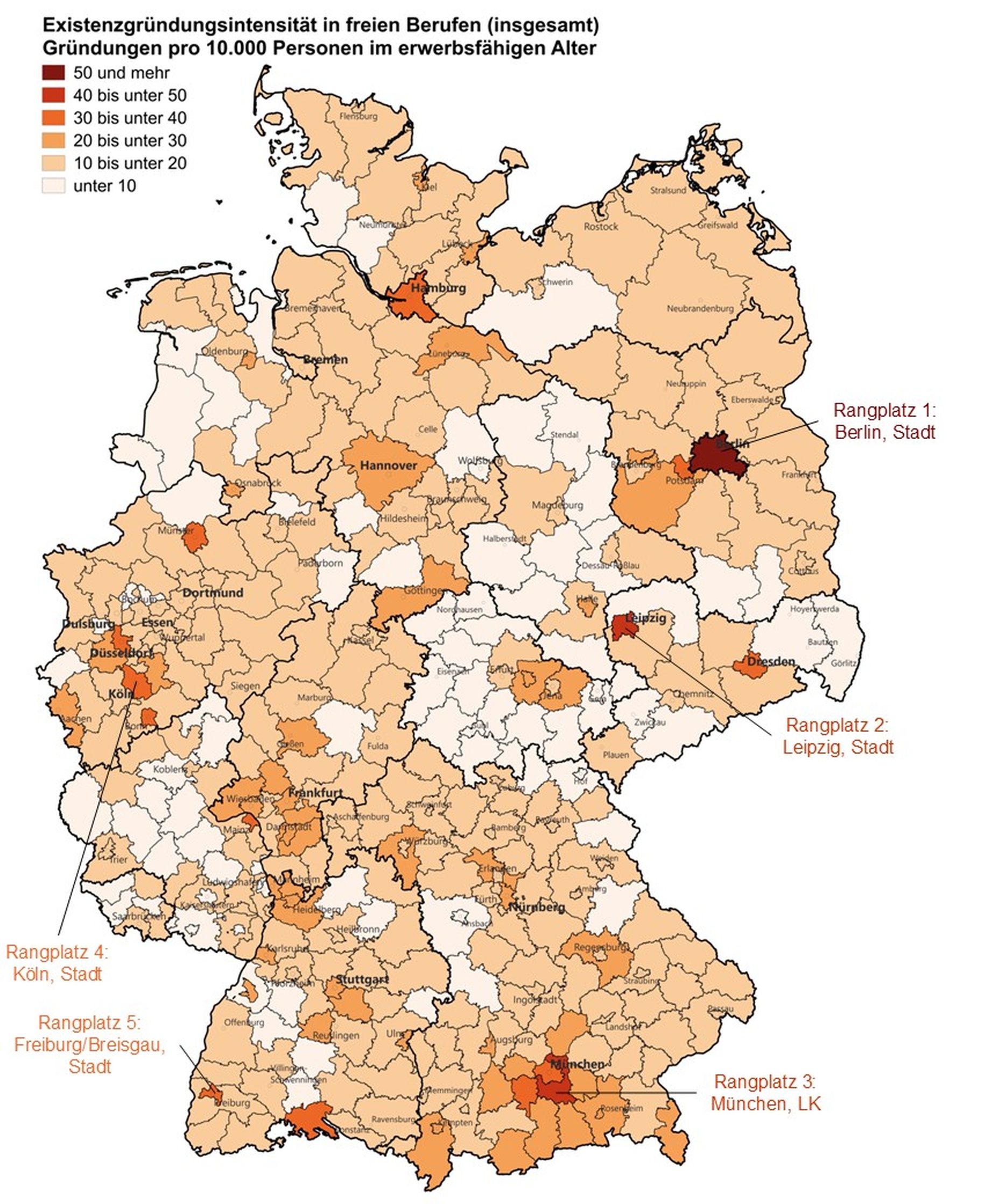 In Berlin starteten in 2024 die meisten Personen in eine eigene freiberufliche Existenz, dahinter folgten die Städte Hamburg, München und Köln. Betrachtet man hingegen die Existenzgründungsintensität – die Anzahl der freiberuflichen Gründungen je 10.000 Einwohner im erwerbsfähigen Alter –, dann liegt zwar gleichfalls Berlin an der Spitze, auf den nächsten Rangplätzen folgen jedoch die Stadt Leipzig, der Landkreis München sowie die Städte Köln und Freiburg im Breisgau.