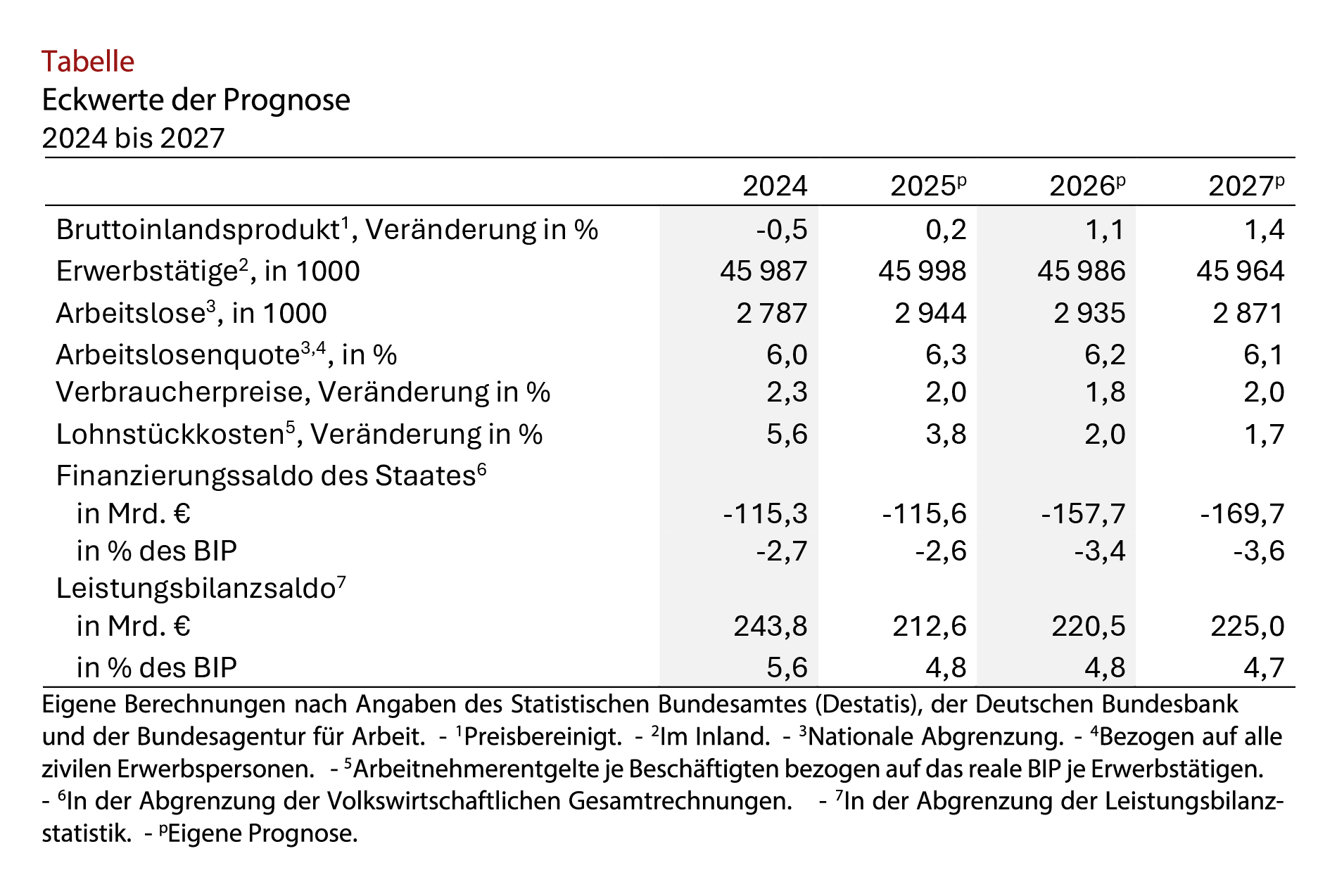 • Der Arbeitsmarkt stagniert: Die Arbeitslosenquote sinkt nur minimal von 6,3 Prozent (2025) auf 6,2 Prozent (2026) und 6,1 Prozent (2027). Die Beschäftigung stagniert bei rund 46 Millionen Erwerbstätigen und geht demografisch bedingt leicht zurück.