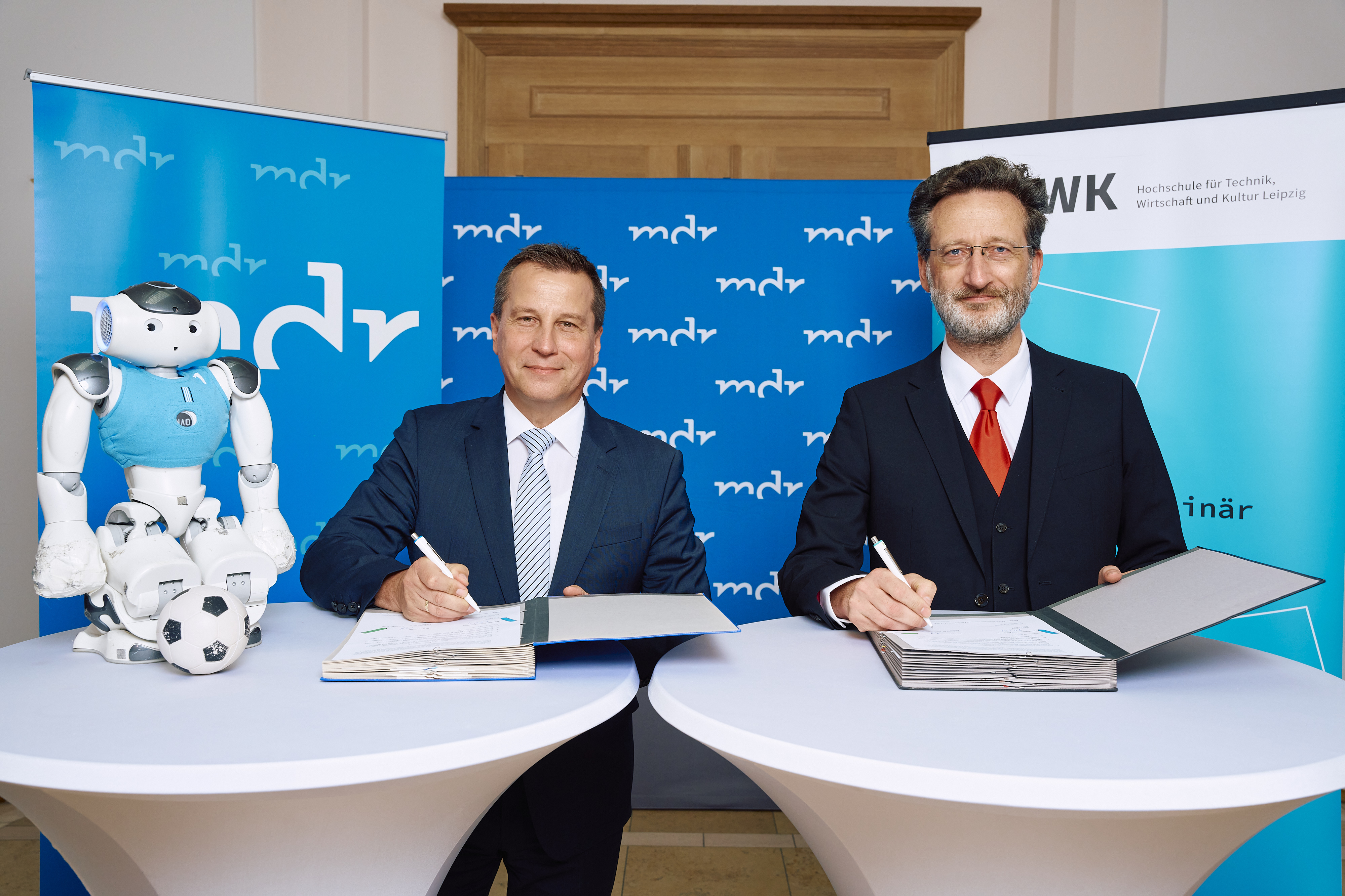 Die Hochschule für Technik, Wirtschaft und Kultur Leipzig (HTWK Leipzig) und der Mitteldeutsche Rundfunk (MDR) erneuern ihre langjährige Kooperation und wollen sich noch enger vernetzen. MDR-Intendant Ralf Ludwig und HTWK-Rektor Professor Dr.-Ing. Jean-Alexander Müller haben dafür heute (05.09.2025) in Leipzig einen Kooperationsrahmenvertrag unterzeichnet. Dieser sieht für die Zukunft einen regelmäßigen Austausch und die Entwicklung neuer gemeinsamer Projekte vor. Ziel ist es, Themen aus Wissenschaft und Bildung für ein breites Publikum gemeinsam stärker sichtbar zu machen und so die Aufmerksamkeit dafür zu erhöhen.