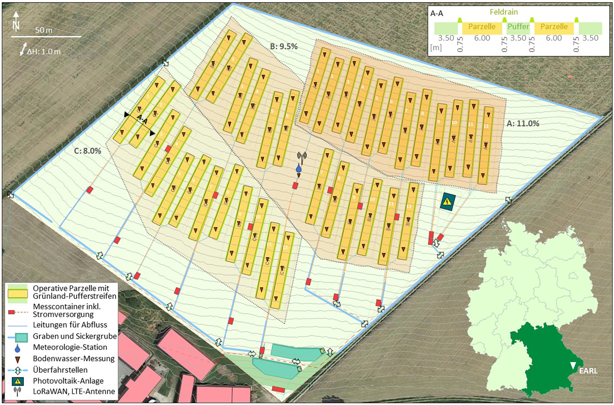 Die Anlage bei Ruhstorf ist rund sechs Hektar groß und hat eine homogene Neigung von acht bis elf Prozent. Auf dieser Fläche befinden sich 36 Versuchsparzellen mit je 55 Meter Länge und sechs Meter Breite, auf denen die Erosion durch den natürlichen Niederschlag gemessen wird. Für die Messung der Austräge wird der Oberflächenabfluss unterhalb jeder Parzelle mit einer Betonrinne aufgefangen und über Rohrleitungen in Messcontainer geleitet. Bisherige Versuche beschränkten sich auf die Erosivität einzelner Kulturen. Die enormen Datenmengen unterschiedlicher Variablen, die das EARL-Projekt künftig liefern wird, ermöglichen die Betrachtung von kompletten Fruchtfolgen in drei verschiedenen, praxisrelevanten Bodenbewirtschaftungs-Regimen über viele Jahre hinweg. Dadurch können landwirtschaftlich relevante Rückschlüsse für die Erosionsminderung gezogen werden, die auf einer praxisnahen Forschung basieren.