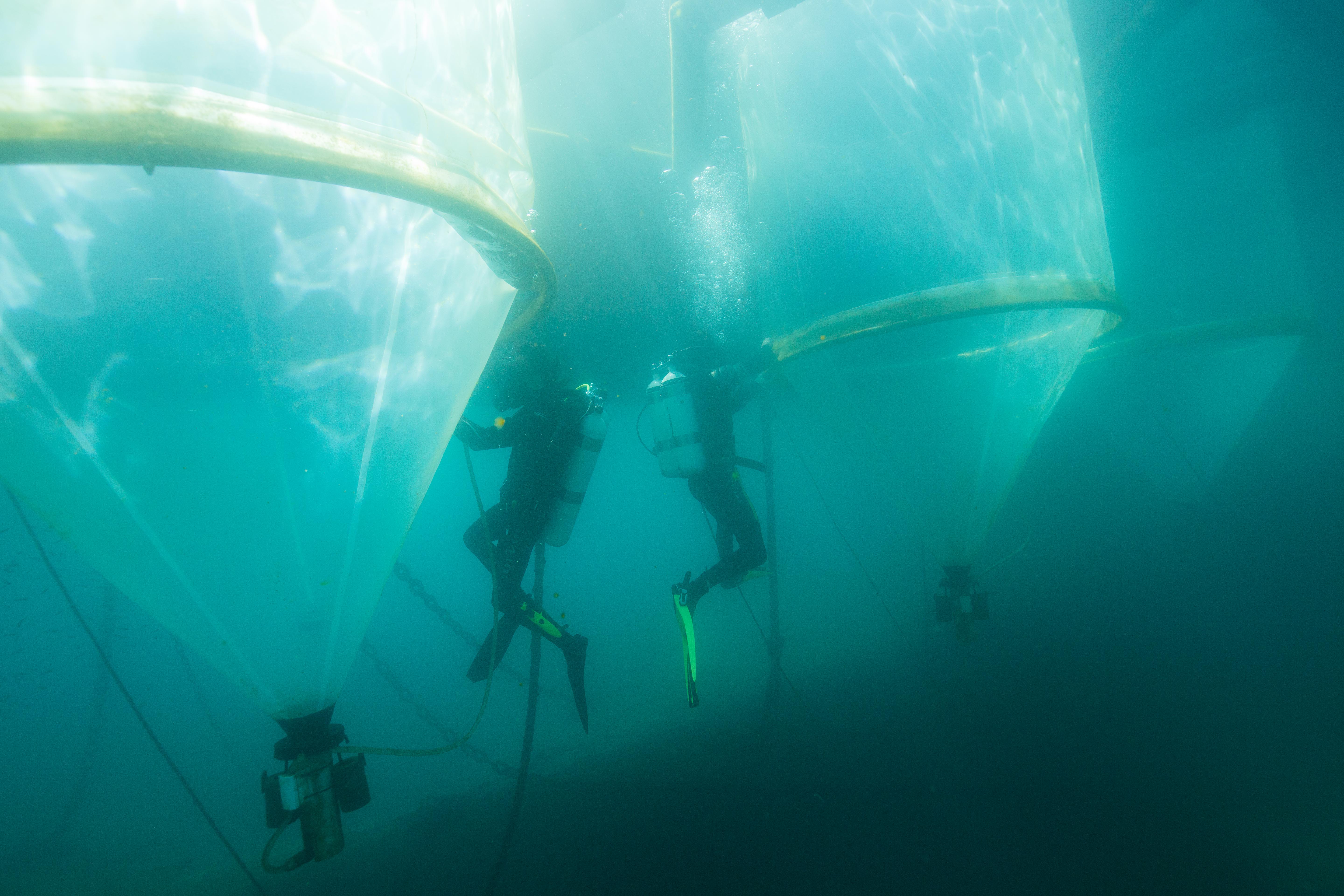 Mit einem Experiment in abgeschlossenen Meeresbehältern vor Gran Canaria untersuchen internationale Forschende unter Leitung des GEOMAR Helmholtz-Zentrums für Ozeanforschung Kiel in den kommenden Wochen, wie sich verschiedene Verfahren der Ozean-Alkalinisierung auf das marine Ökosystem auswirken. In so genannten Mesokosmen lassen sich natürliche Ökosysteme unter kontrollierten Bedingungen beobachten wie in überdimensionierten Reagenzgläsern. Erstmals werden bei der jetzigen Studie zwei Ansätze systematisch miteinander verglichen: die Zugabe von bereits gelösten Mineralien und die Einbringung von fein gemahlenem Gestein ins Meerwasser.