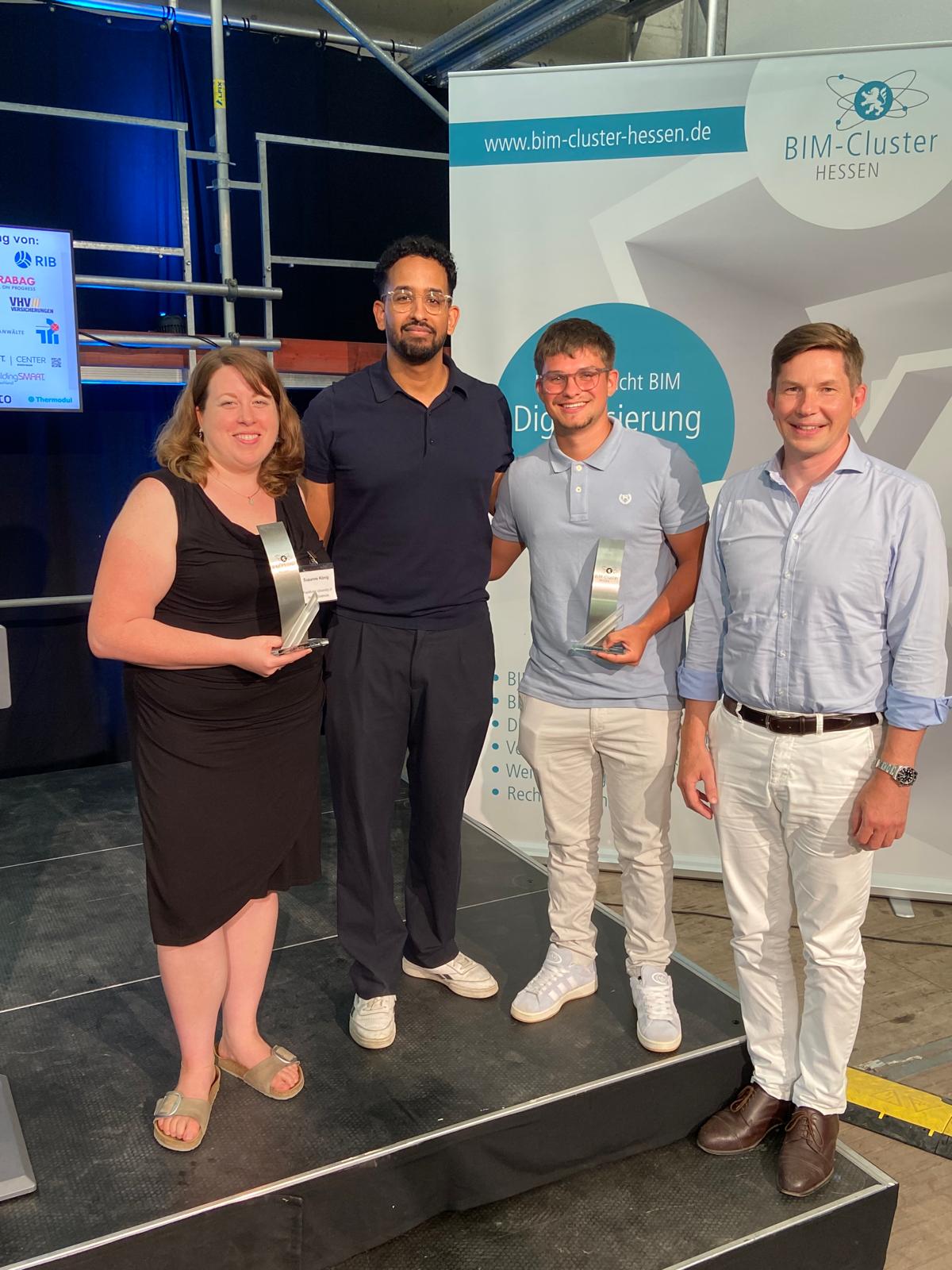 Der „BIM-Award“ des BIM Cluster Hessen e. V. prämiert seit 2018 Projekte, die den Mehrwert und das Potenzial der BIM Methode im digital basierten Kooperieren und Handeln aufzeigen – ob in Unternehmenskooperationen oder wissenschaftlichen Netzwerken. 2022 wurde erstmals der BIM-Award von den drei Clustern Hessen, Rheinland-Pfalz und Nordrhein-Westfalen ausgeschrieben. https://bim-cluster-hessen.com/