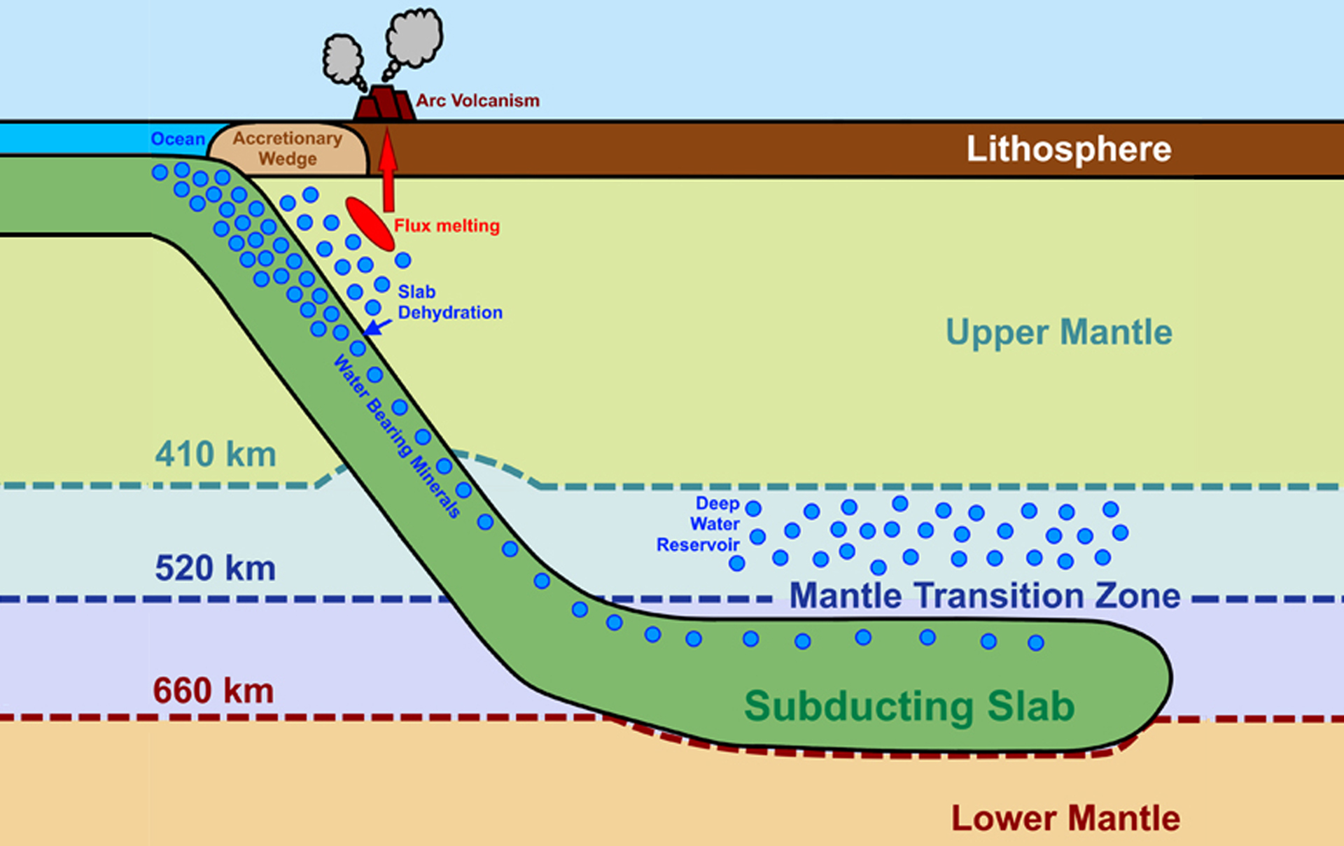An Mineralien gebundenes Wasser kann jedoch in der Platte überleben, sofern dort einige Regionen ausreichend kalt bleiben, um die Bildung von wasserhaltigen Hochdruckphasen zu ermöglichen. So kann Wasser auch in tiefe Regionen des Erdmantels wie die Mantelübergangszone in 410 bis 660 Kilometern Tiefe oder sogar in den noch tieferen unteren Mantel transportiert werden. Das führt beispielsweise dazu, dass sich in der Mantelübergangszone das größte Wasserreservoir unseres Planeten befindet, in dem bis zu drei Mal mehr Wasser gespeichert ist als in den Ozeanen.