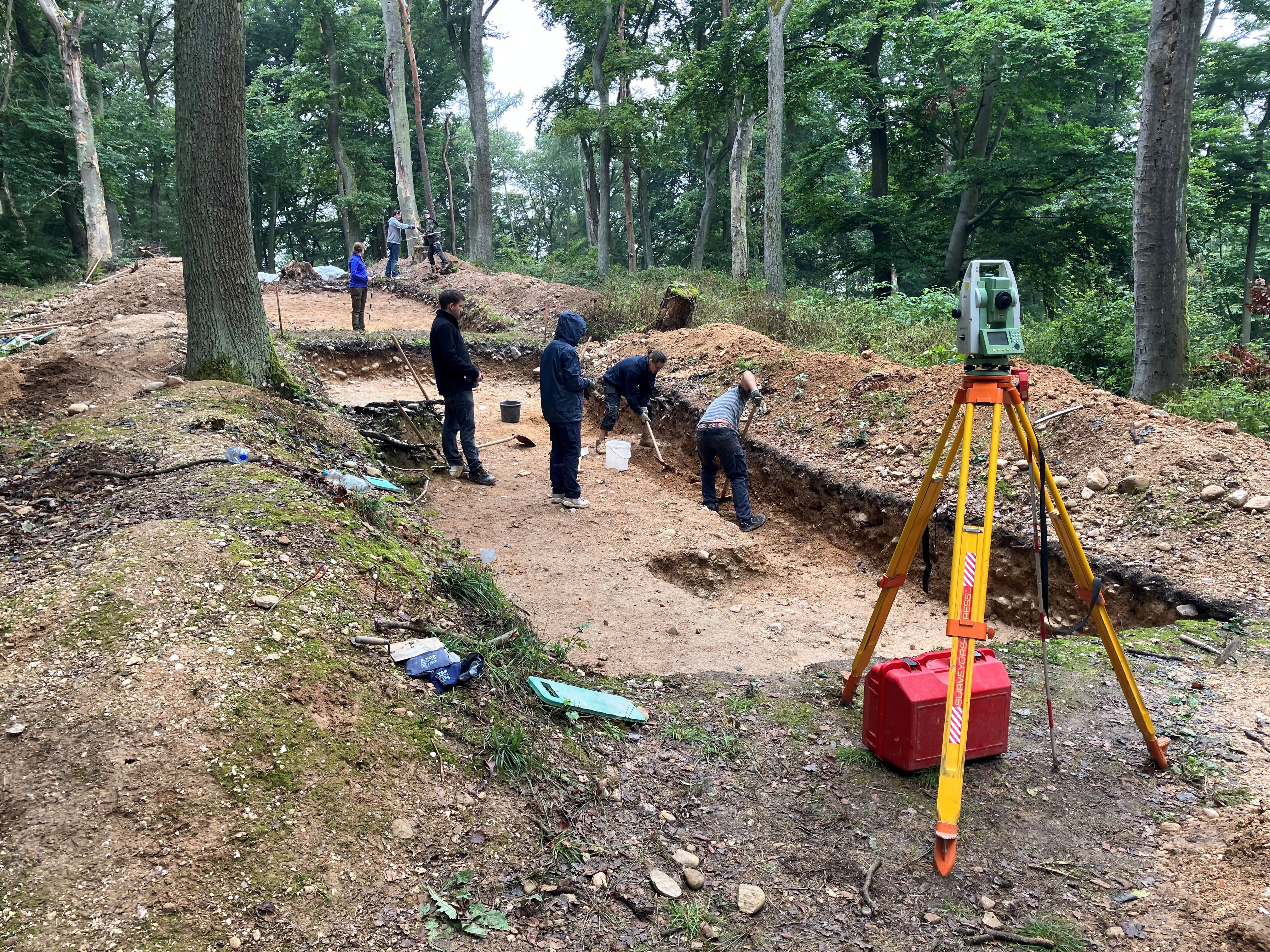 Im Fokus der diesjährigen archäologischen Grabung am Kapellenberg vom 01. bis 19. September 2025 stand wieder der steinzeitliche Grabhügel. Er wurde vermutlich um 4.100 v. Chr. errichtet. Nachdem das Forschungsteam 2024 bereits einen 34 x 5 Meter großen Grabungsschnitt angelegt hatte, der vom Fuß des Hügels bis zum vermuteten Bereich der ehemaligen Grabkammer reichte, wurde dort nun weiter gegraben. Ziel ist es, neue Erkenntnisse über die Konstruktion des Hügels zu gewinnen.