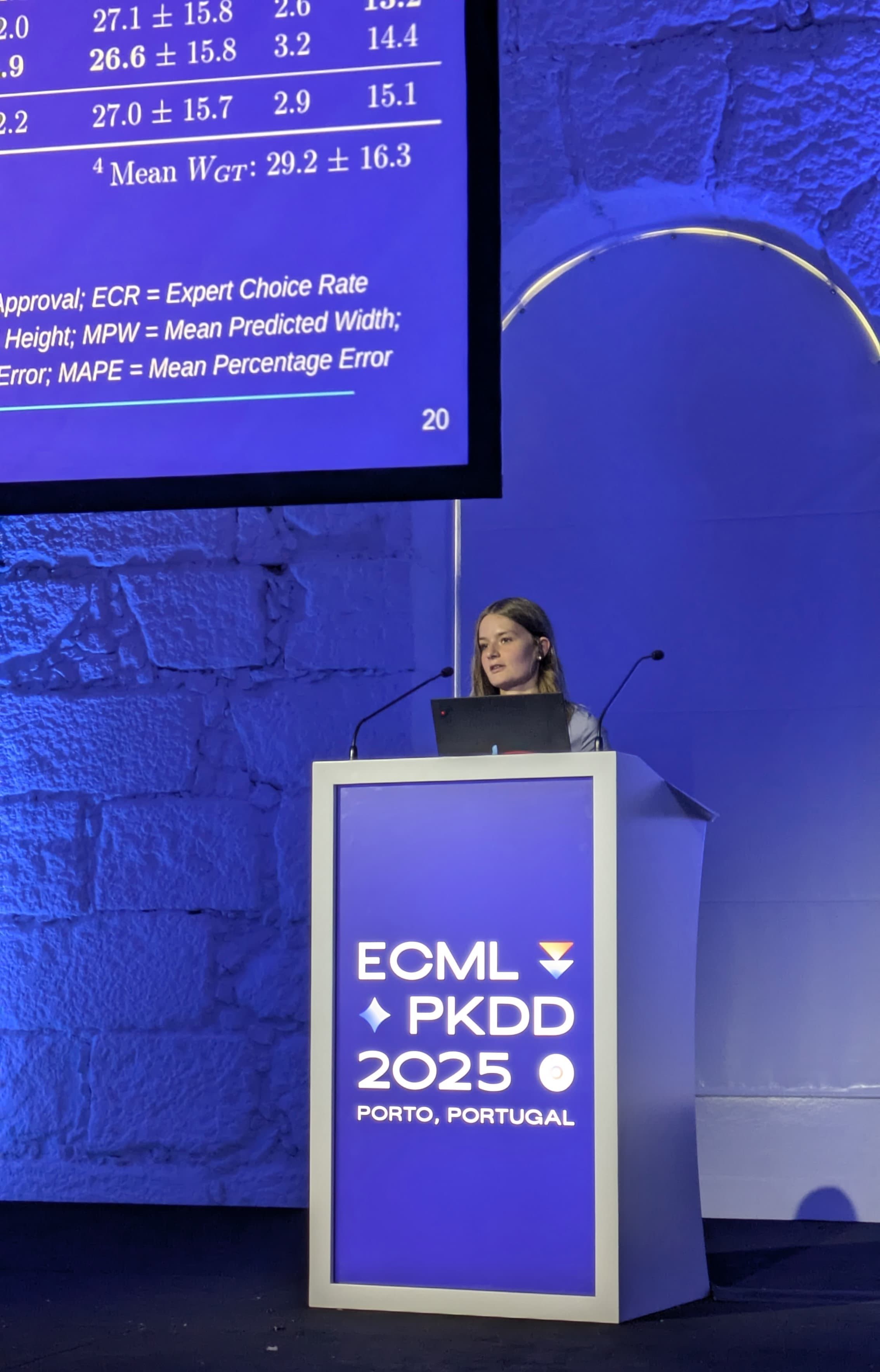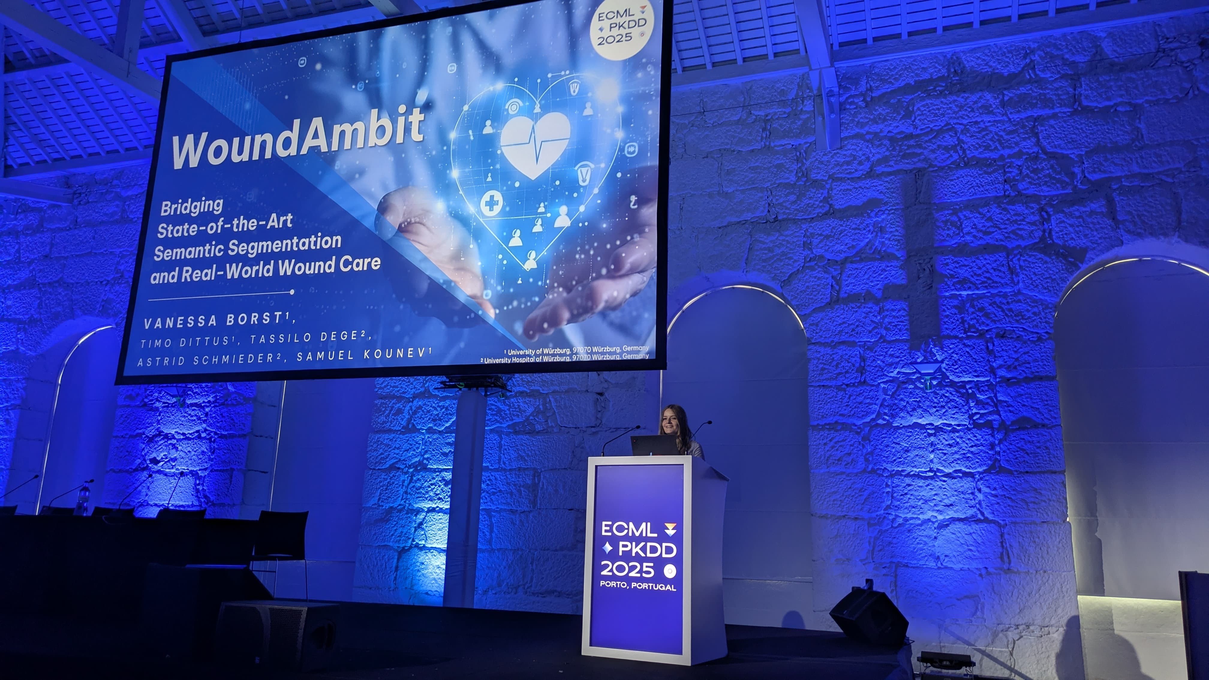 Diese so genannte semantische Segmentierung galt es sodann mit der realen Wundversorgung zu verbinden. „Konkret bedeutet das: Aus den von der KI erkannten Wundflächen mussten verlässliche Größenangaben in Millimetern oder Zentimetern abgeleitet werden. Gerade unterschiedliche Aufnahmebedingungen – etwa wenn die Kamera einmal näher und einmal weiter von der Wunde entfernt ist – machen diese Umrechnung besonders herausfordernd“, erläutert Vanessa Borst. Für diesen Brückenschlag, also dem Übertrag der hochentwickelten KI auf die praxisnahe, verständliche und nützliche Versorgung, gewann die Informatikerin jetzt auf der European Conference on Machine Learning and Principles and Practice of Knowledge Discovery in Databases (ECML PKDD) 2025 in Porto (Portugal) den „Best Student Paper Applied Data Science Track“. Den Beitrag „WoundAmbit: Bridging State-of-the-Art Semantic Segmentation and Real-World Wound Care“ stellte sie am 18. September 2025 in Porto persönlich vor. ECML PKDD ist die wichtigste europäische Konferenz zu Maschinellem Lernen und Data Mining – also zur Entdeckung von Mustern in großen Datenmengen.