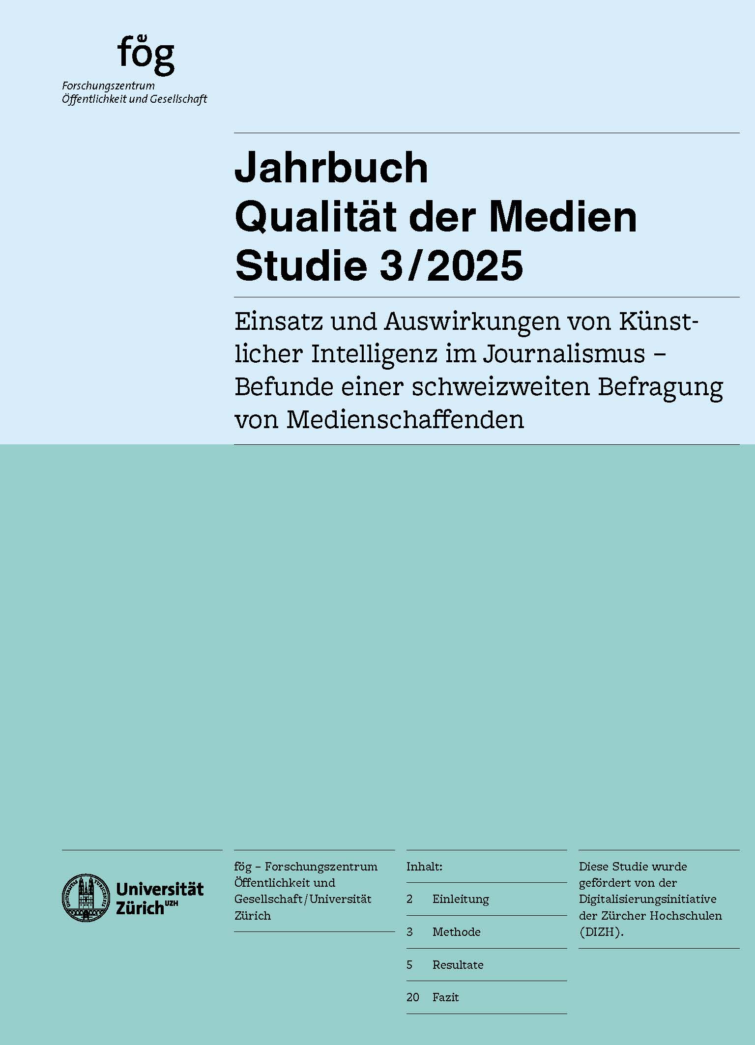 Silke Fürst et al. Jahrbuch Qualität der Medien Studie 3/2025: Einsatz und Auswirkungen von Künstlicher Intelligenz im Journalismus – Befunde einer schweizweiten Befragung von Medienschaffenden. Forschungszentrum Öffentlichkeit und Gesellschaft (fög) der Universität Zürich (UZH)