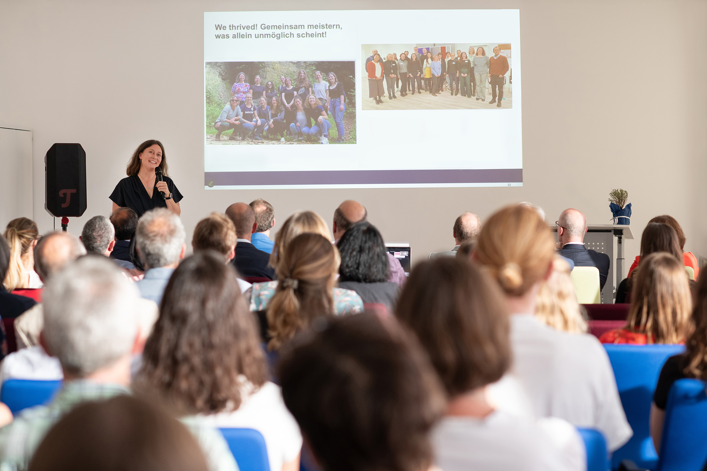 Professorin Olga Pollatos, ebenfalls Mitglied der professoralen Leitung der PHSA und Leiterin der Abteilung Klinische & Gesundheitspsychologie, erläuterte in ihrem Impulsvortag ihre Forschung zu Faktoren, die die Wahrnehmungsfähigkeit für körperliche Signale beeinflussen: „Wir erfassen Körper- und mentale Prozesse im Alltag sowie im Verlauf von Psychotherapien. Denn die Arbeit an Emotionen, unter Einbeziehung des Körpers, wird sich perspektivisch positiv auf den Therapieerfolg auswirken.“ Auch technisch unterstützte, innovative Anwendungen wie etwa Neurostimulation können dazu beitragen, die Brücke zwischen Forschung und praktischer Versorgung erfolgreich zu schlagen.