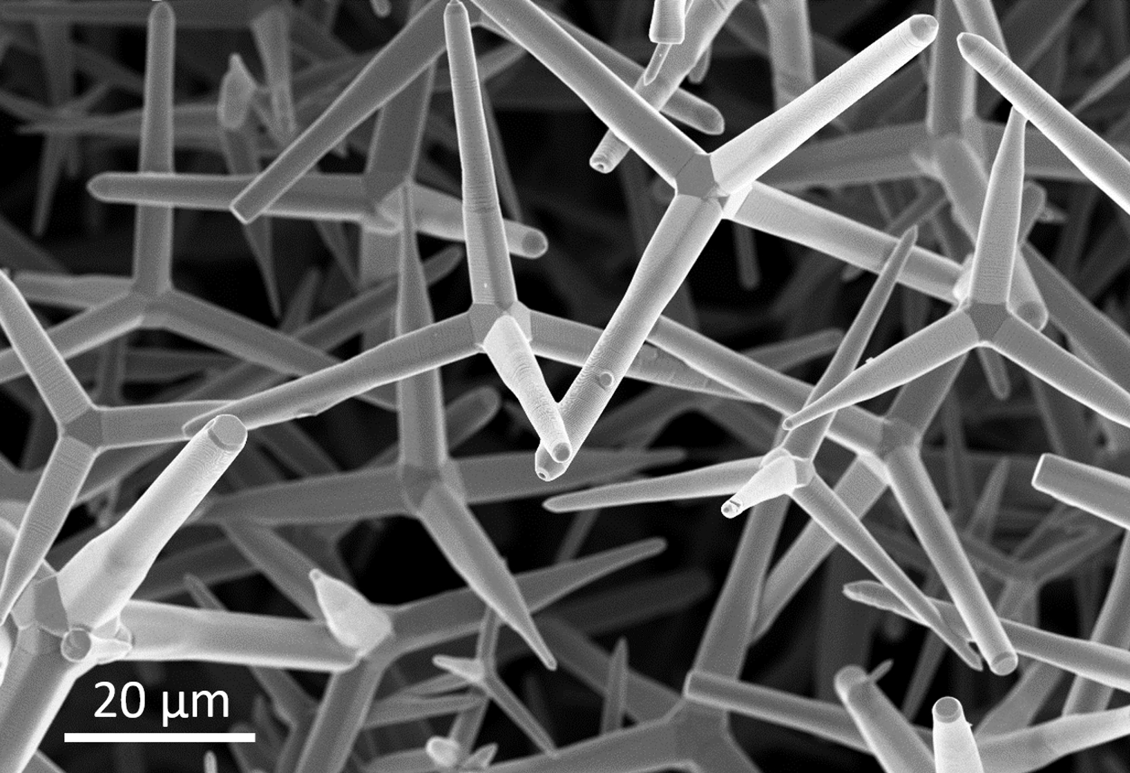 Aero materials are based on tetrapodal zinc oxide (t-ZnO) structures – tiny particles shaped like four-armed stars. Researchers form this basic structure into a three-dimensional scaffold and infiltrate it with a mixture of water and graphene – a single layer of carbon atoms – or with silicate, the main component of glass. The zinc oxide is then chemically removed. What remains are hollow tubes with ultrathin nanometer-scale walls, forming an open network of pure graphene sheets or glass structures with extremely low density – almost entirely air. The open-pored structure remains intact, allowing air and liquids to flow through freely.