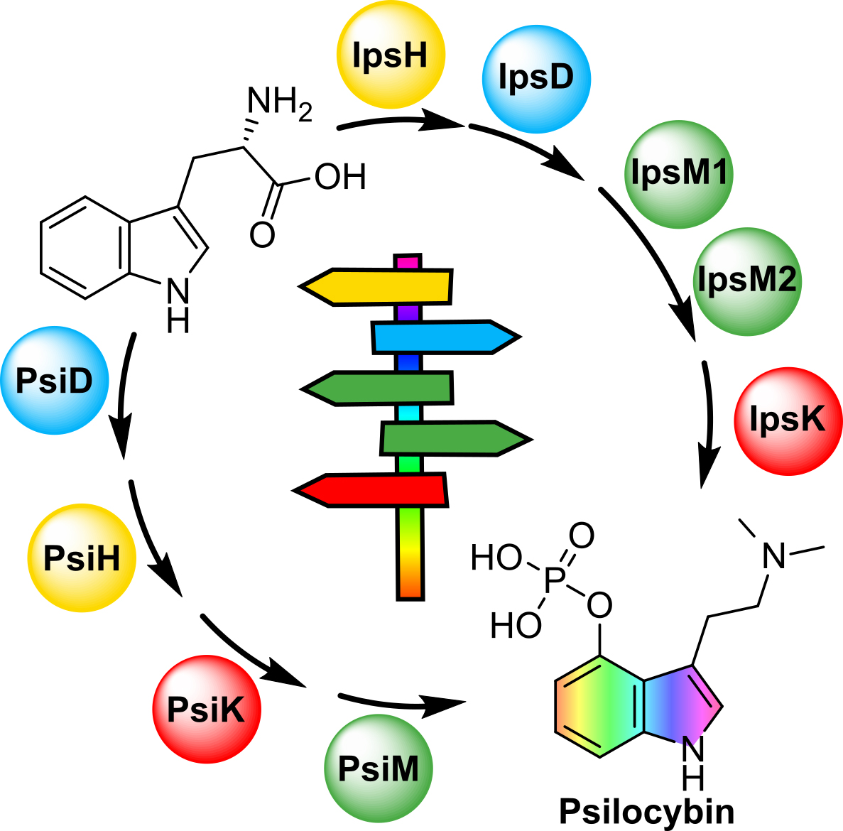 Schäfer T, Haun F, Rupp B, Hoffmeister D (2025) Dissimilar Reactions and Enzymes for Psilocybin Biosynthesis in Inocybe and Psilocybe Mushrooms. Angew Chem Int Ed, https://doi.org/10.1002/anie.202512017