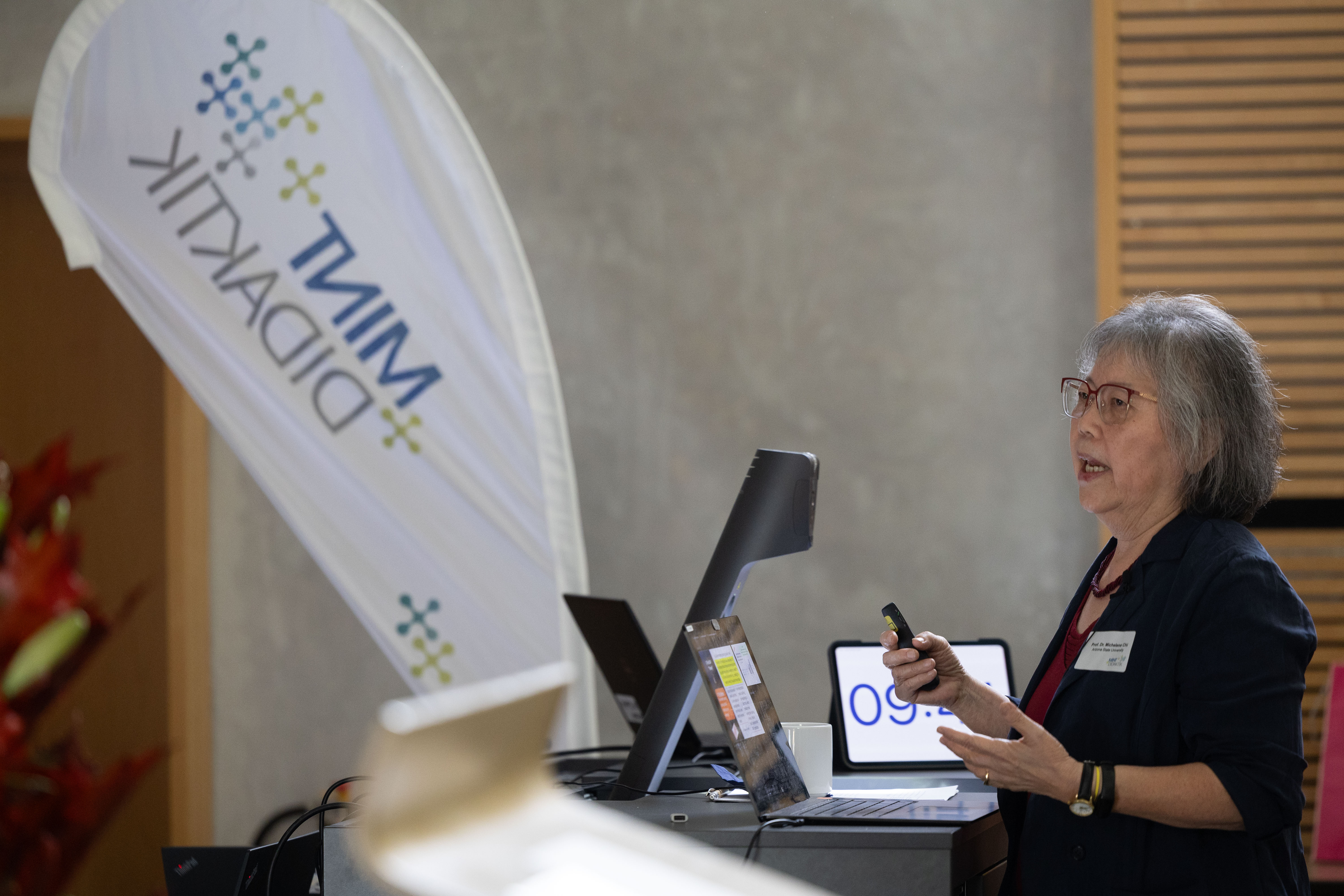 Ein besonderes Highlight des Symposiums war die Keynote von Prof. Dr. Michelene Chi (Arizona State University), eine der weltweit führenden Bildungsforscherinnen und Yidan-Preisträgerin für Bildungsforschung 2023. In ihrem Vortrag „ICAP: Defining How Students Engage to Learn in Active Learning“ stellte sie das von ihr entwickelte ICAP-Modell vor – eine differenzierte Theorie des Lernens, die vier Formen der Beteiligung beschreibt: passive, active, constructive und interactive. Das Modell bietet Lehrenden konkrete Ansatzpunkte, um Lernprozesse gezielt wirksam zu gestalten. Neben theoretischen Grundlagen zeigte Prof. Chi auch zahlreiche praxisnahe Beispiele, wie bereits kleinere Veränderungen in der Lehre tiefere, nachhaltig lernförderliche Prozesse bei den Studierenden anstoßen können.