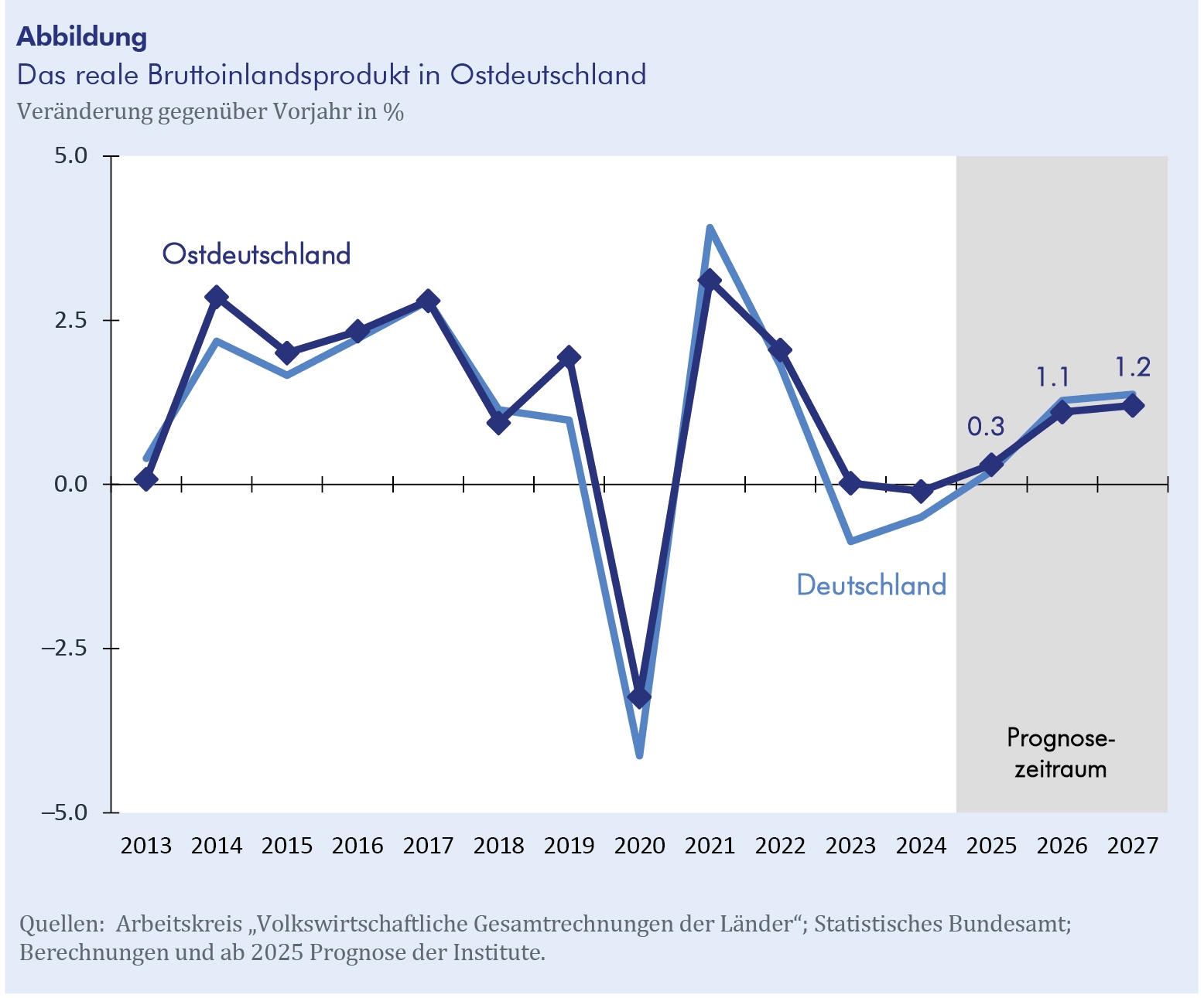 Im Jahr 2025 dürfte die Wirtschaft in Ostdeutschland wie in Deutschland insgesamt kaum mehr als stagnieren. Im kommenden Jahr stimulieren finanzpolitische Impulse die Konjunktur. Deren Effekte dürften allerdings etwas schwächer ausfallen als in Deutschland insgesamt. Das Leibniz-Institut für Wirtschaftsforschung Halle (IWH) rechnet damit, dass die Expansionsrate der ostdeutschen Wirtschaft für das Jahr 2025 mit 0,3% leicht höher liegt als in Deutschland insgesamt (0,2%). In den beiden Folgejahren wird sie auf 1,1% respektive 1,2% anziehen, etwas weniger deutlich als im Westen.